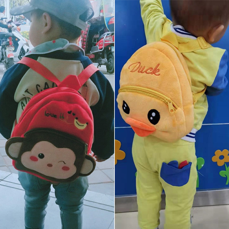"Färgglad barnryggsäck i mjuk plysch med cartoon-djurtryck, justerbar rem och perfekt storlek för förskolebarn."