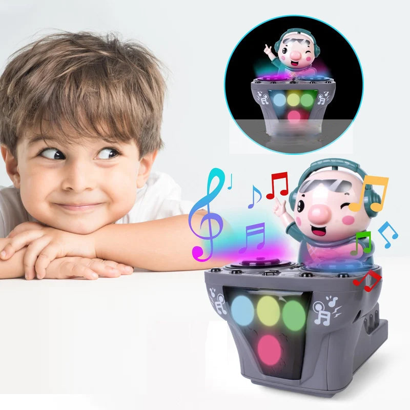 "DJ grisleksak med ljus, färger och musik för barn, i rörelse på DJ-bord. Underhållande leksak för lek och skratt."