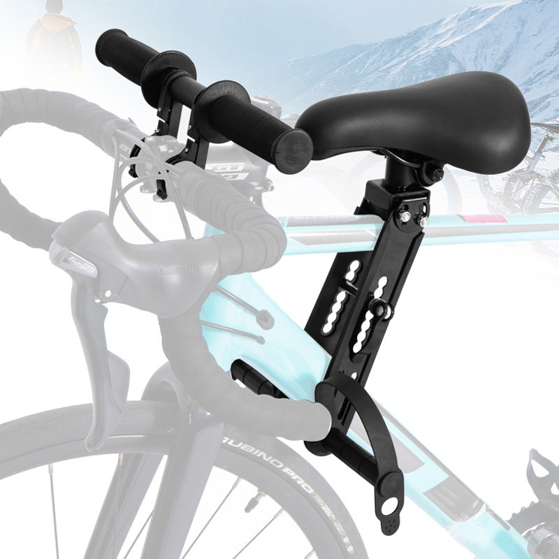 "Frontmonterad barnsadel och styre för cykling, svart, med justerbar design för säkerhet och komfort vid familjeturer"