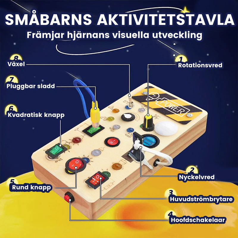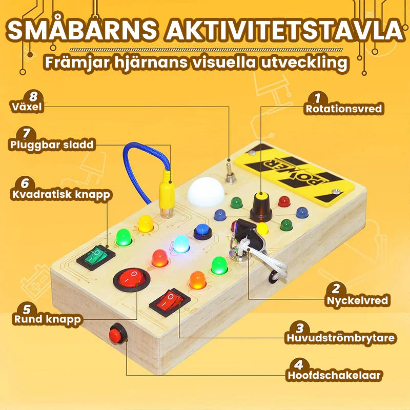 "Interaktiv sysselsättningsbräda för småbarn med färgglada LED-lampor och aktiviteter av naturligt trä för kreativ lek."