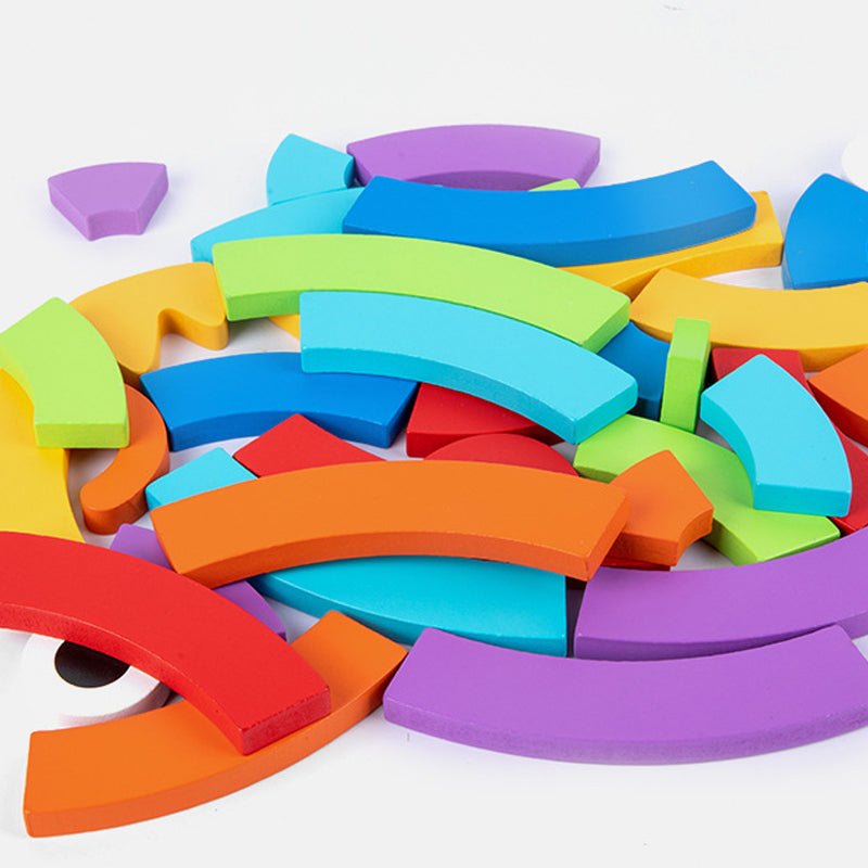 "Färgglatt träpussel för barn med regnbågsformad design, stimulerar kreativitet och inlärning med unika former."