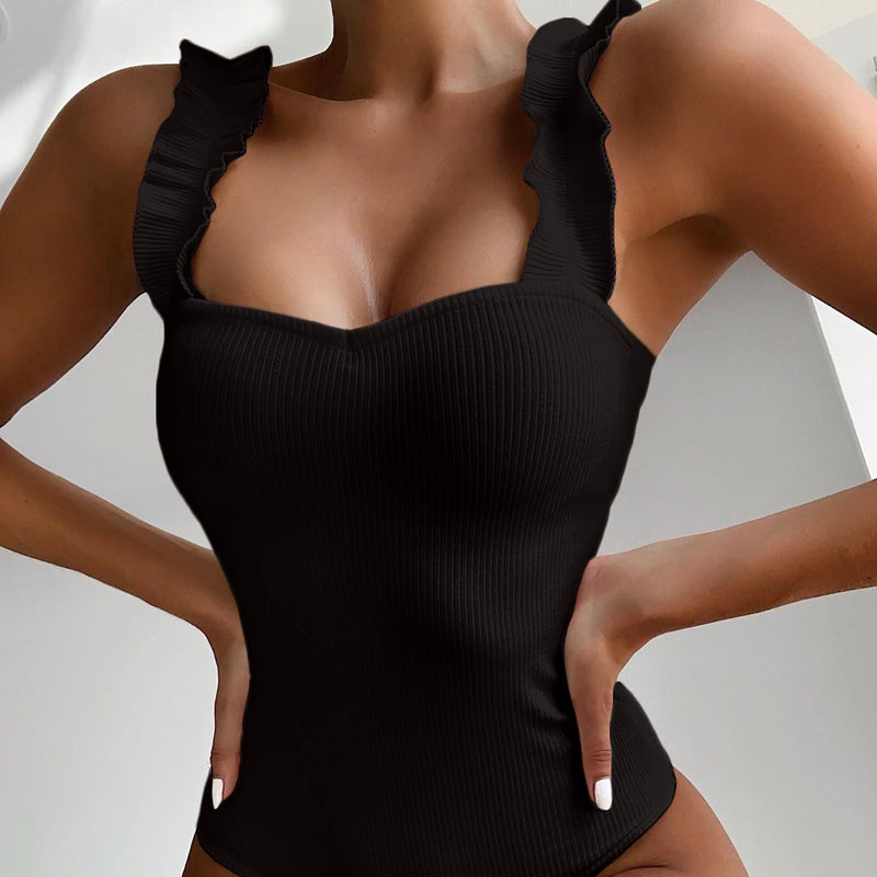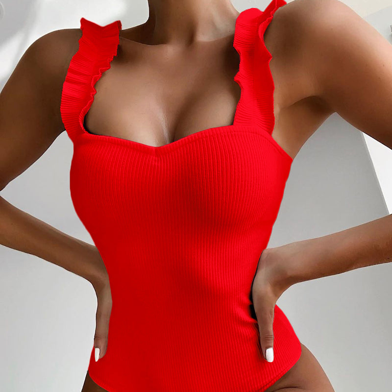 Enfärgad baddräkt för kvinnor med volangband, figursmickrande design och tidlöst utseende för strand och pool.