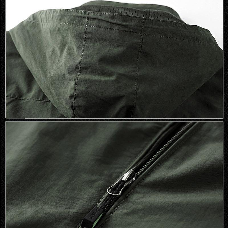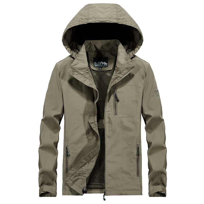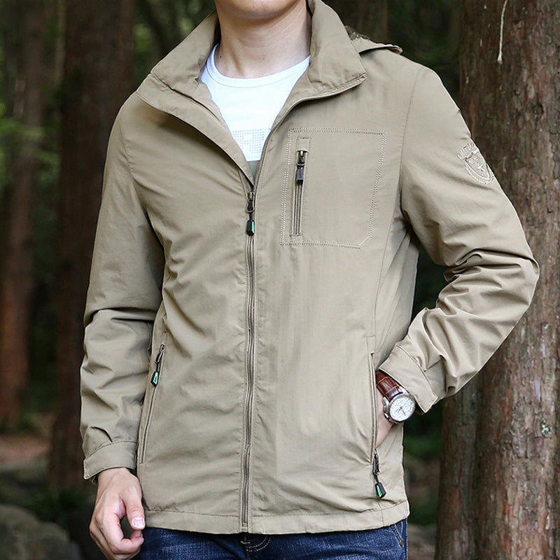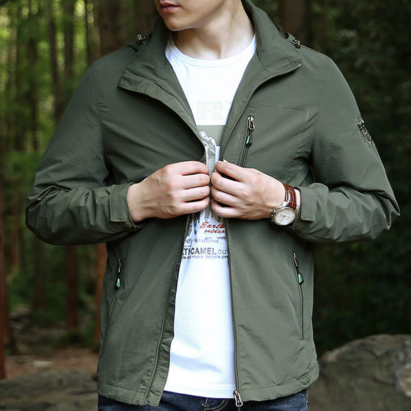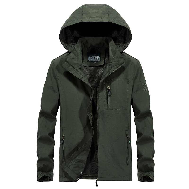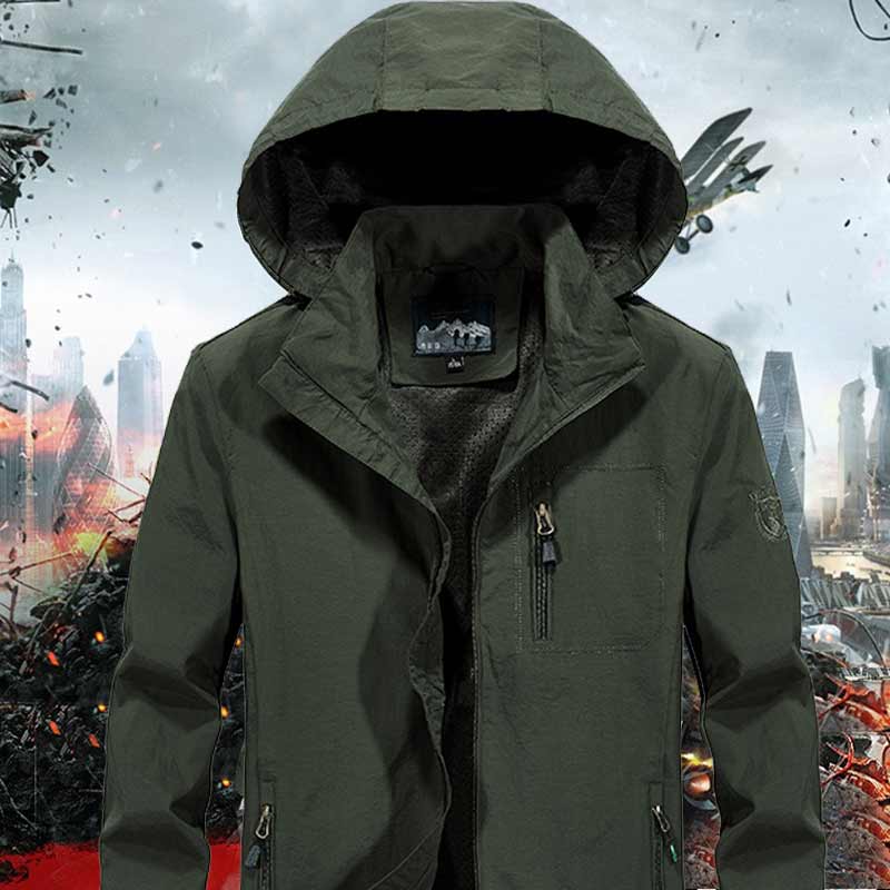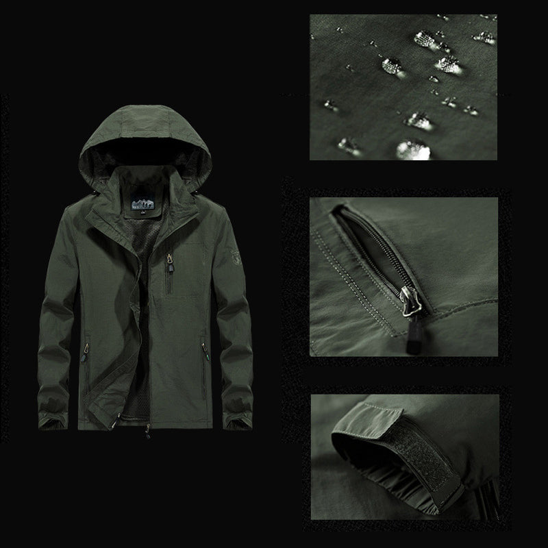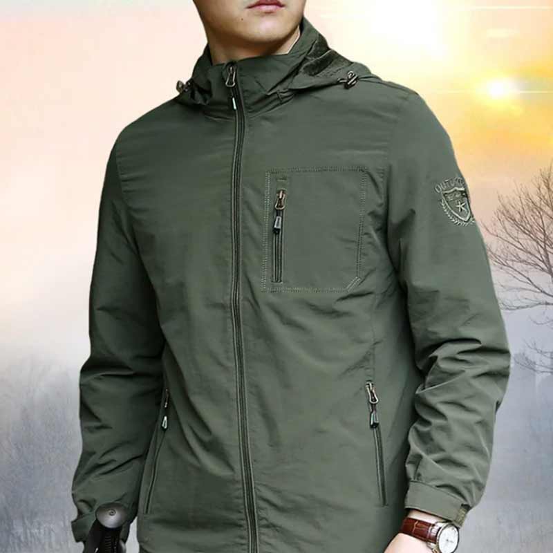 "Vattentät utomhus herrjacka i armégrönt, vindtät, med dragkedja och fickor, perfekt för äventyr i naturen."