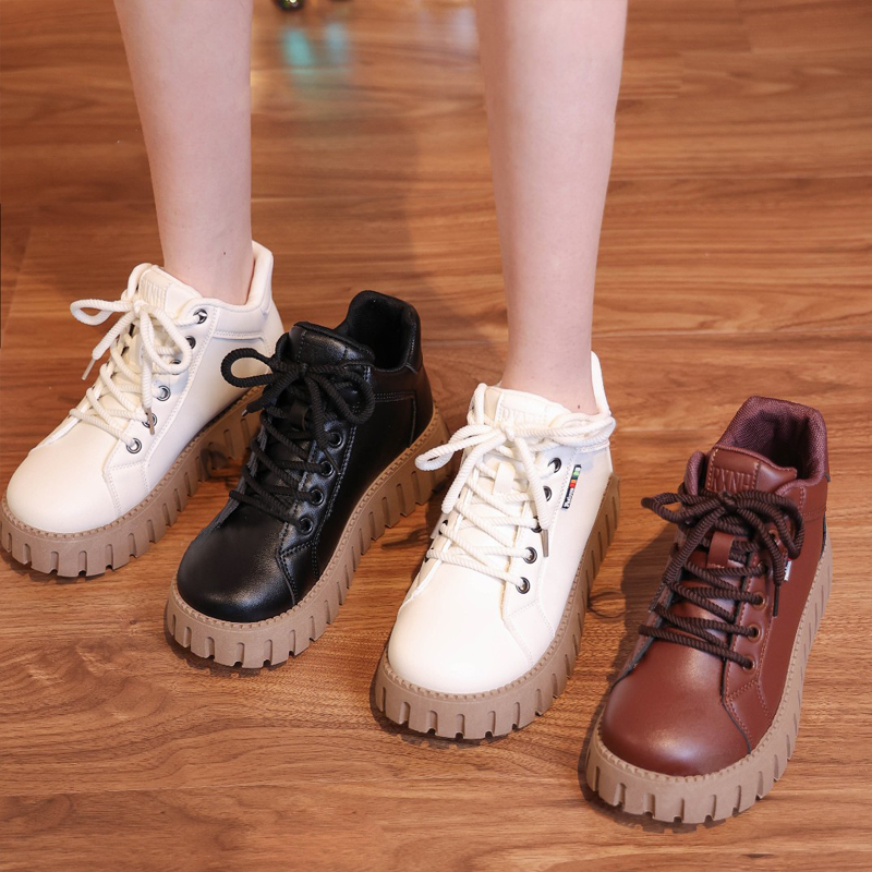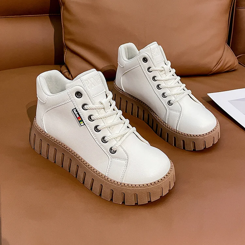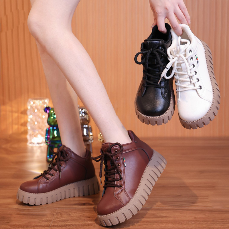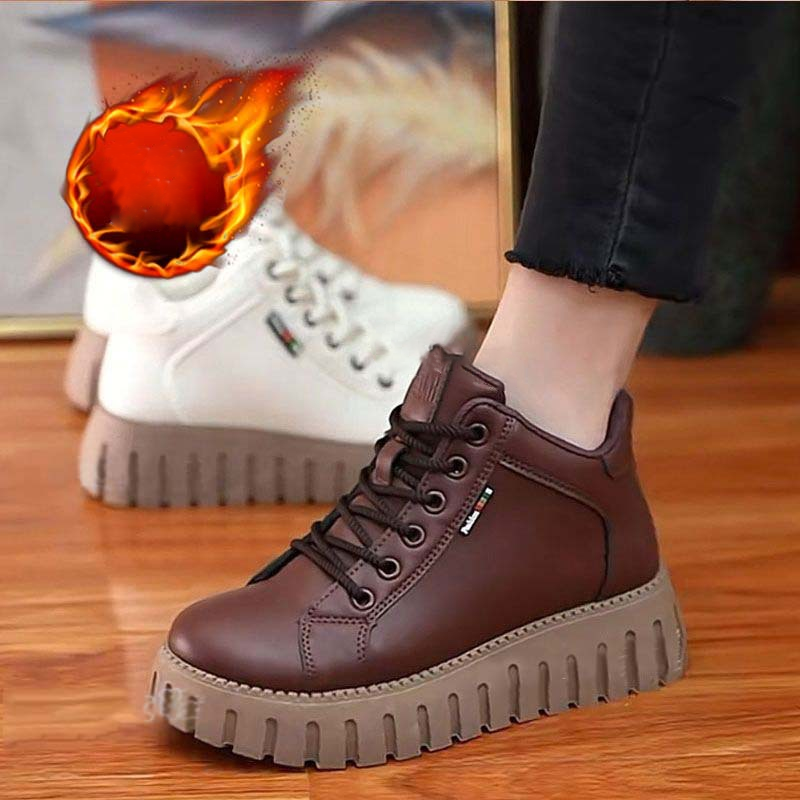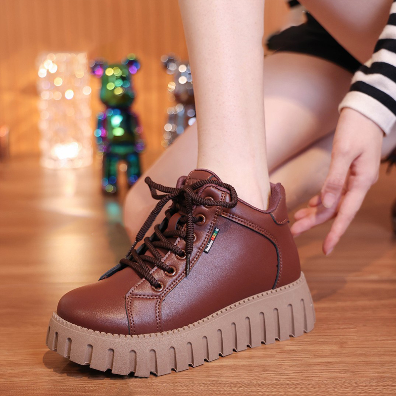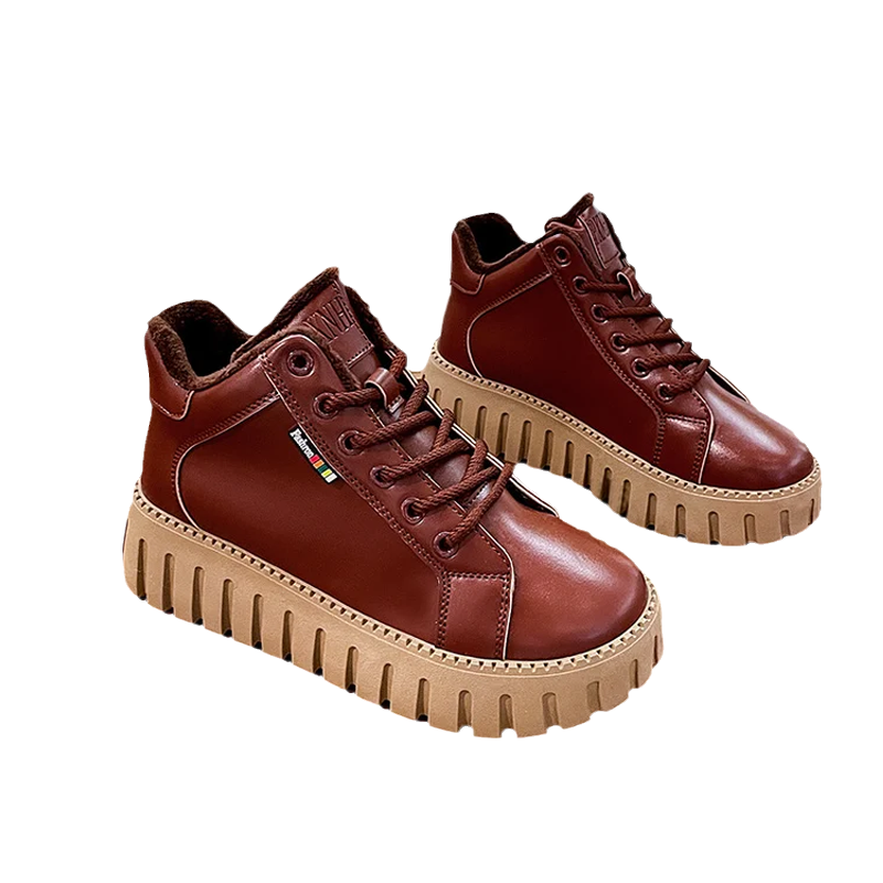 "Damstövlar i brunt läder med tjock sula, rund tå och elegant design för stilfull och bekväm vardagsanvändning."