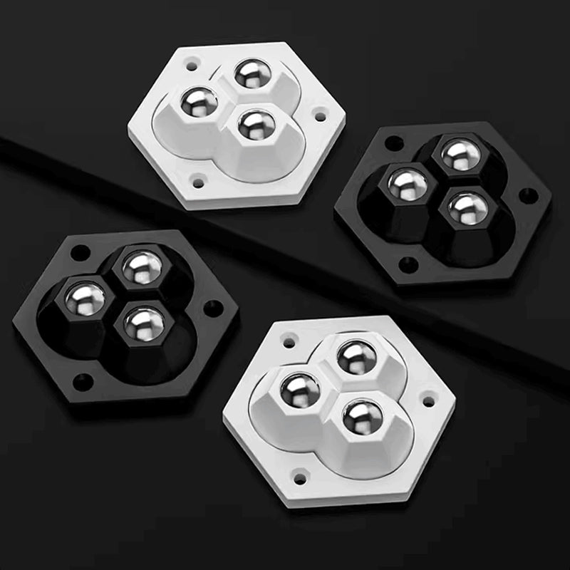 "360° roterande treklots hjul, elegant design i svart och vitt, för smidig manövrering av möbler och förvaring"