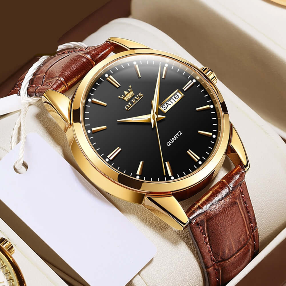 Denna sofistikerade klocka kombinerar tidlös design med moderna funktioner. Med ett hållbart läderarmband sitter den bekvämt på handleden och ger en touch av klass till din outfit. Kvartsurverket garanterar exakt tidshållning, medan de självlysande visarna och markeringarna gör det enkelt att läsa av tiden även i svagt ljus. Oavsett om du är på kontoret eller njuter av fritiden, kompletterar denna klocka din stil perfekt.