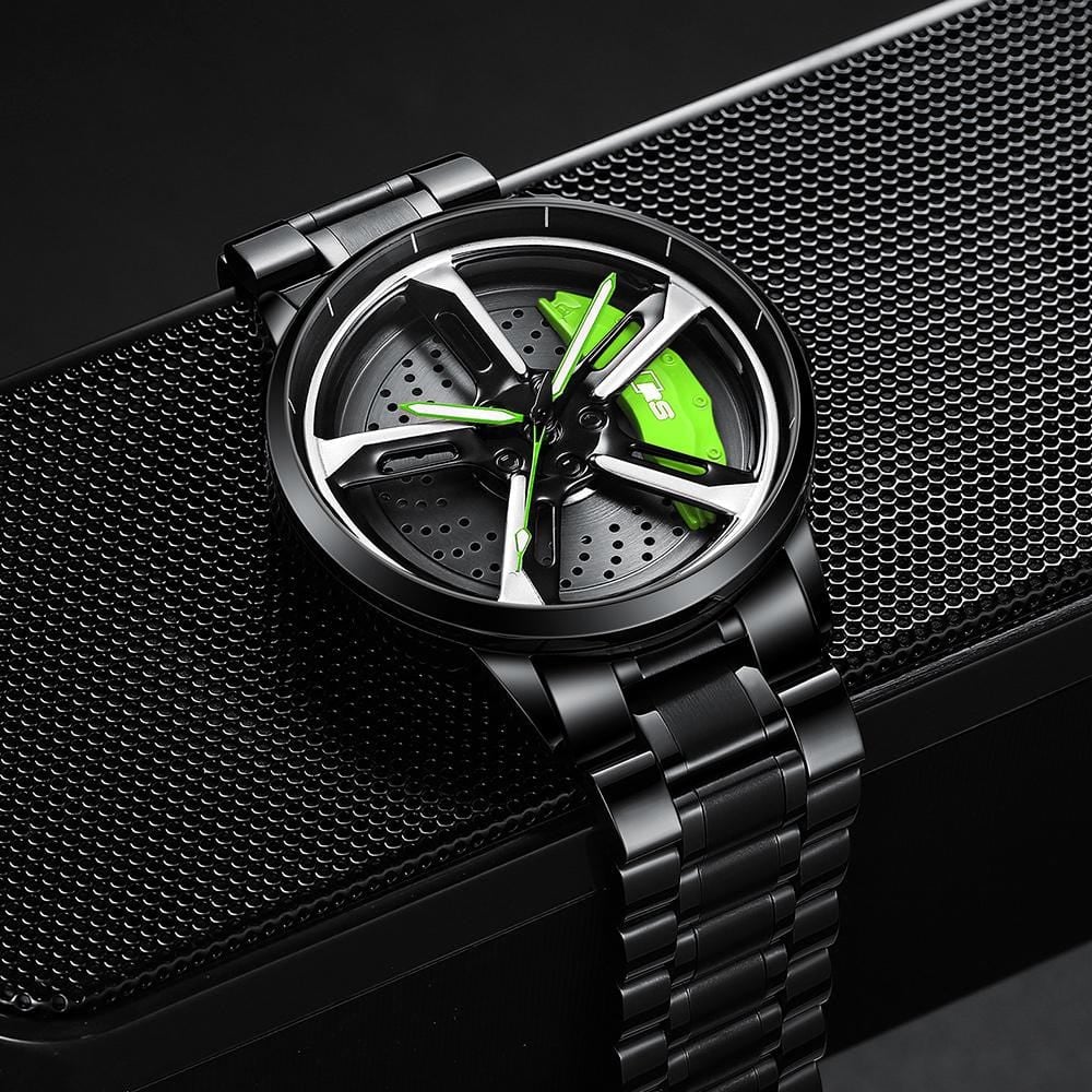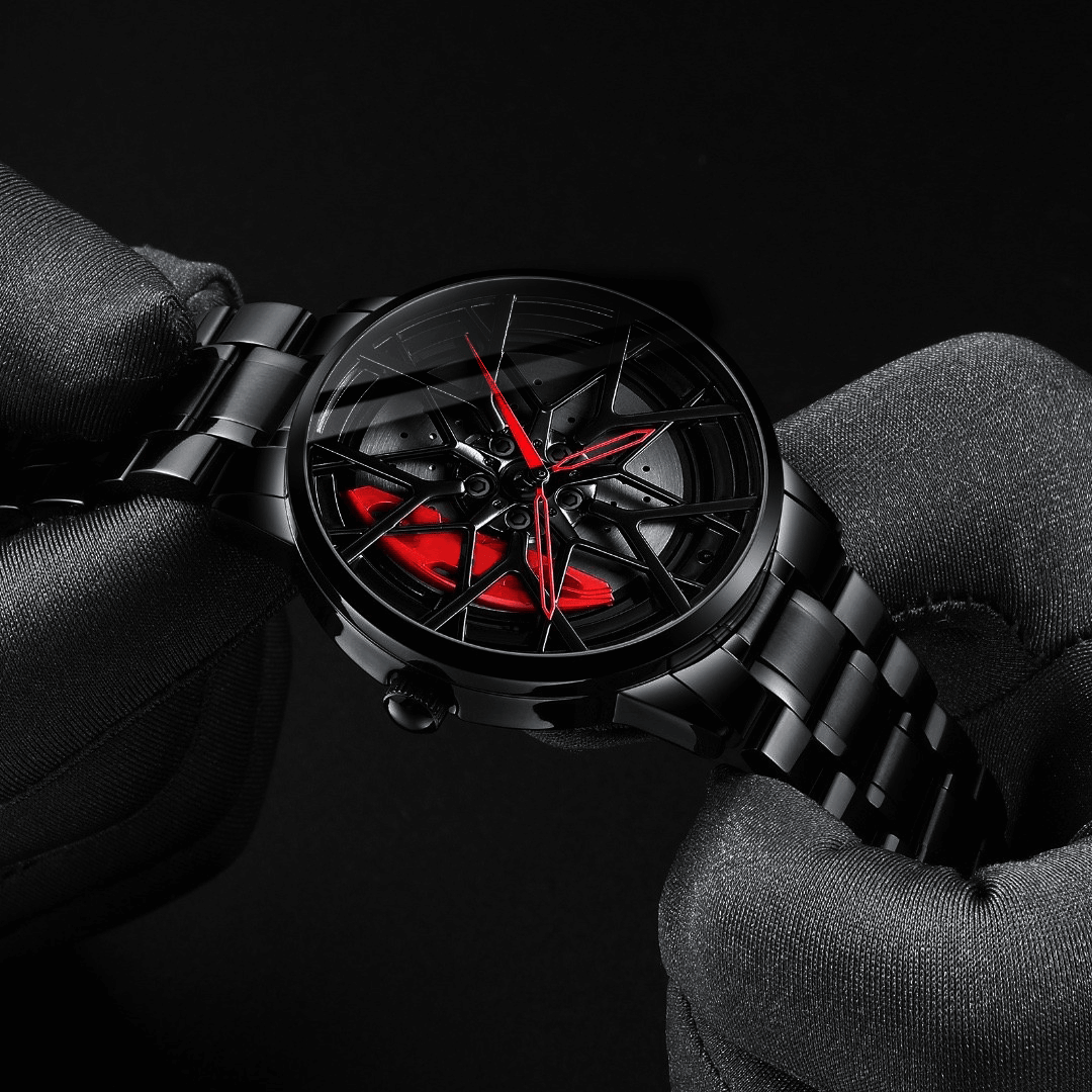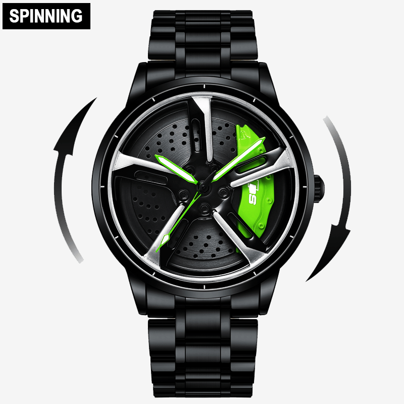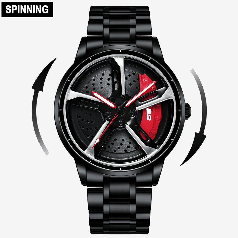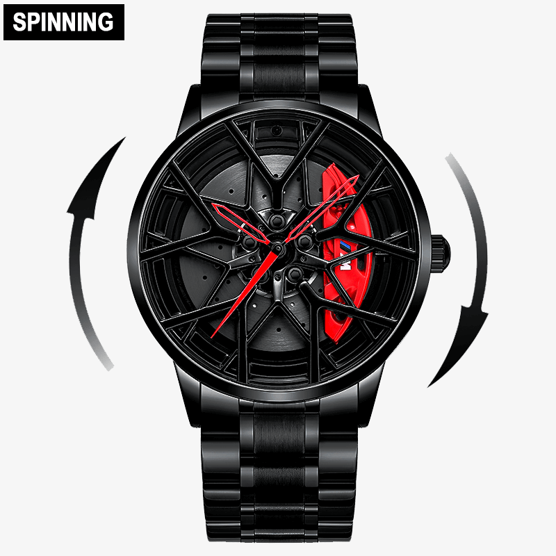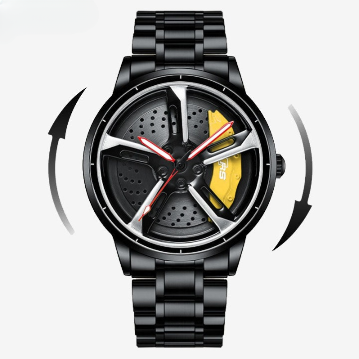 Hur fungerar detta? Den traditionella urtavlan fungerar på samma sätt som din traditionella klocka. Den snurrande varianten är unik. När du vrider handleden snurrar hjulet inuti urtavlan fritt. Detta efterliknar effekten av en bil i rörelse!