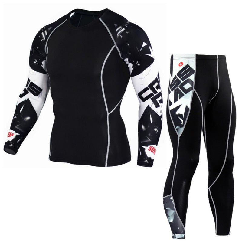 "Herr sportkläder tights och långärmad tröja i grått, stretchigt tyg, designad för träning och rörelsefrihet."