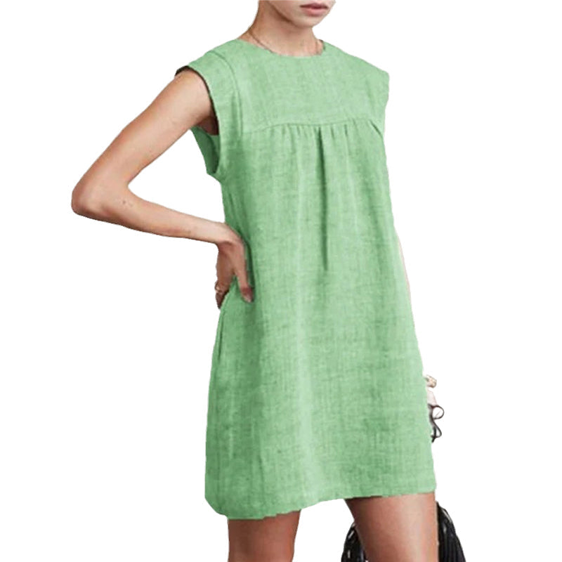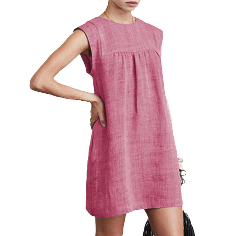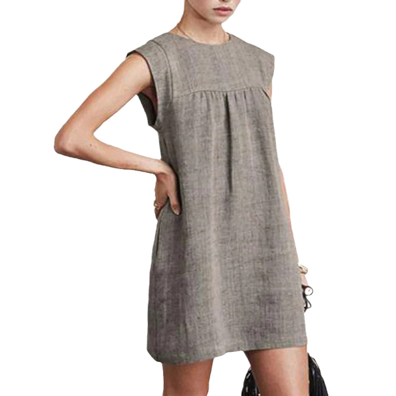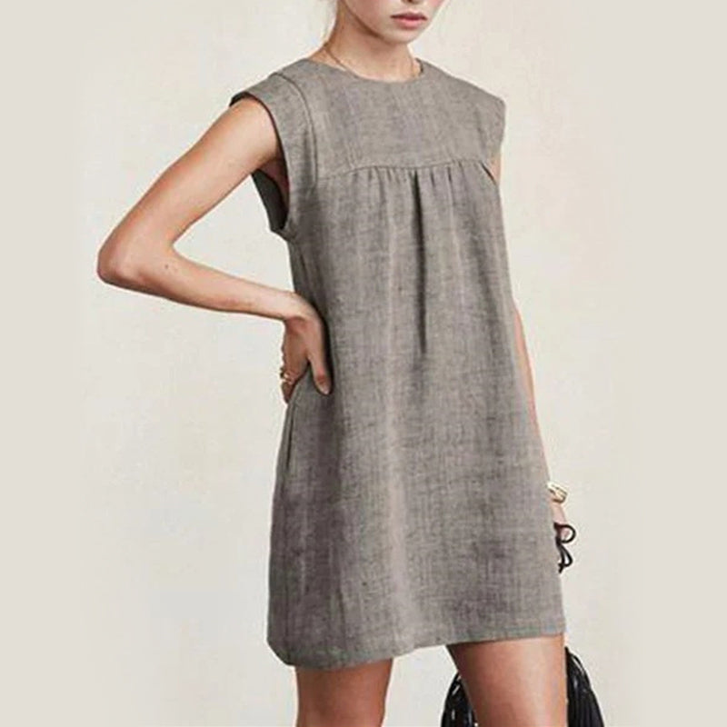 Upptäck sommarens mångsidighet med denna ärmlösa klänning i bomullslinne, perfekt för en avslappnad dag i solen. Den naturliga fiberblandningen gör den lätt och andningsbar, vilket passar idealiskt för varma dagar.