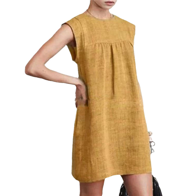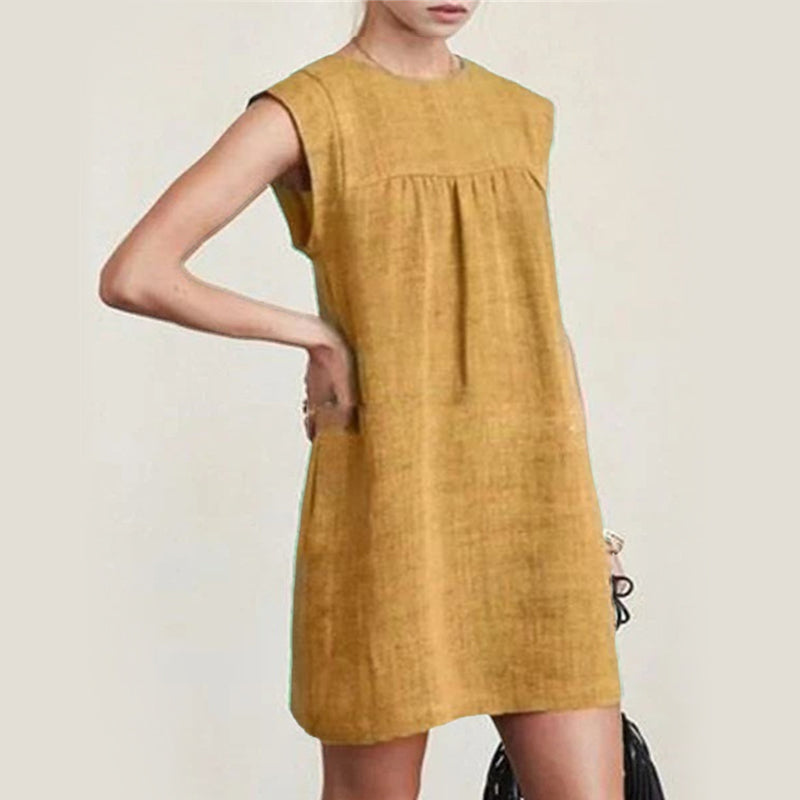 "Dambomullslinne klänning i färgglad gul design, ärmlös med enkel stil och naturliga material för sommardagar."