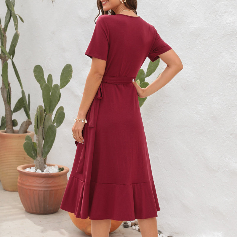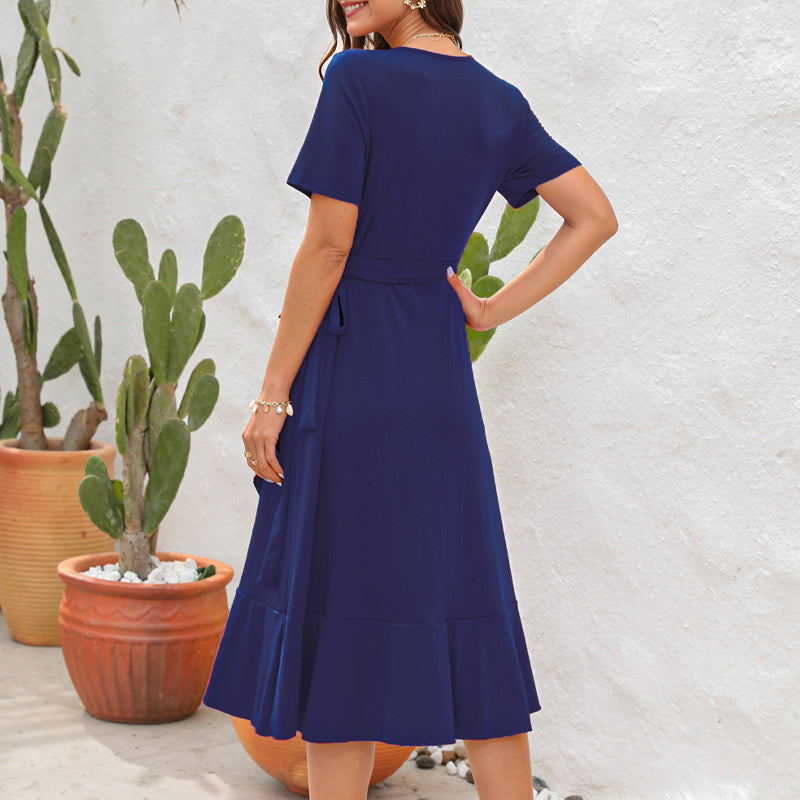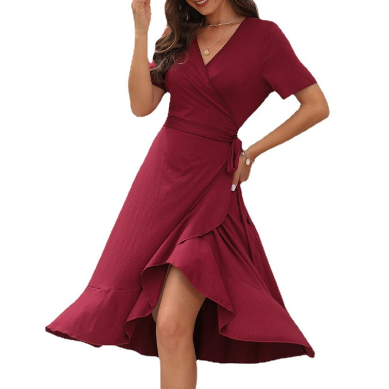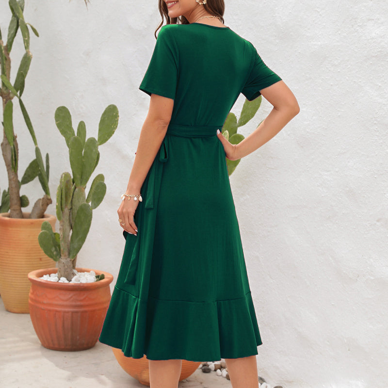 Elegant V-ringad Damklänning med Asymmetrisk Volang