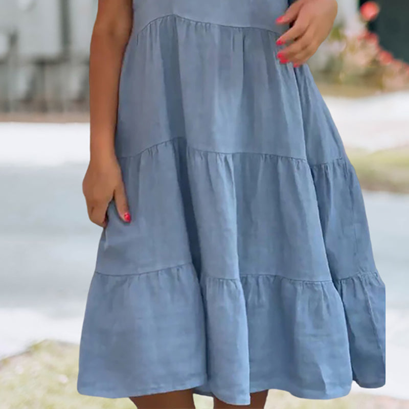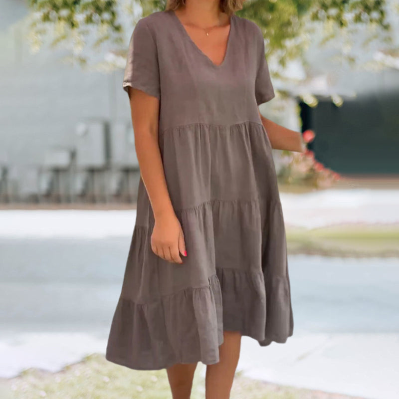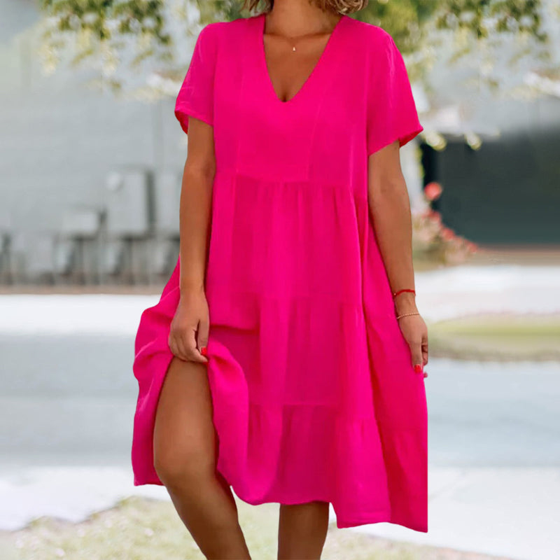 "Eleganta V-hals skiftklänning i mjuk bomullsblandning, knä-lång, perfekt för alla vardagsstilar."