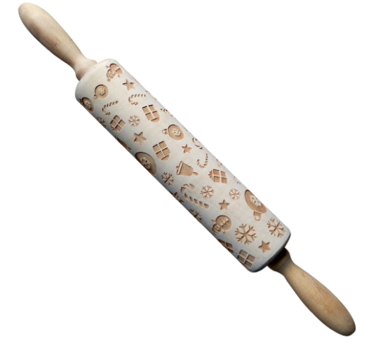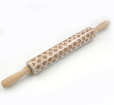 "Träkavel med julmotiv, perfekt för bakning, visas med detaljerade mönster idealiska för festliga bakverk."
