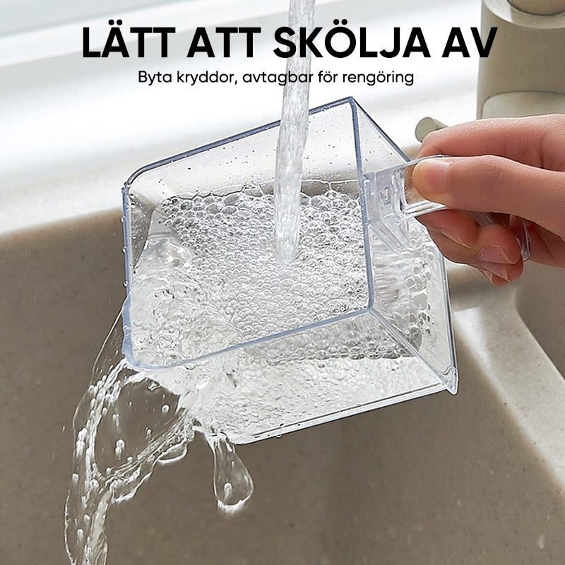 Med denna väggmonterade kryddförvaring kan du säkerställa att dina kryddor alltid är organiserade och lättillgängliga. Den moderna och stilrena designen anpassar sig till alla kök och ger en elegant touch. Tack vare den starka tätningen hålls kryddorna fräscha och skyddade mot fukt och damm. Dessutom, eftersom den är återanvändbar, kan du enkelt rengöra och byta ut kryddor när du önskar.