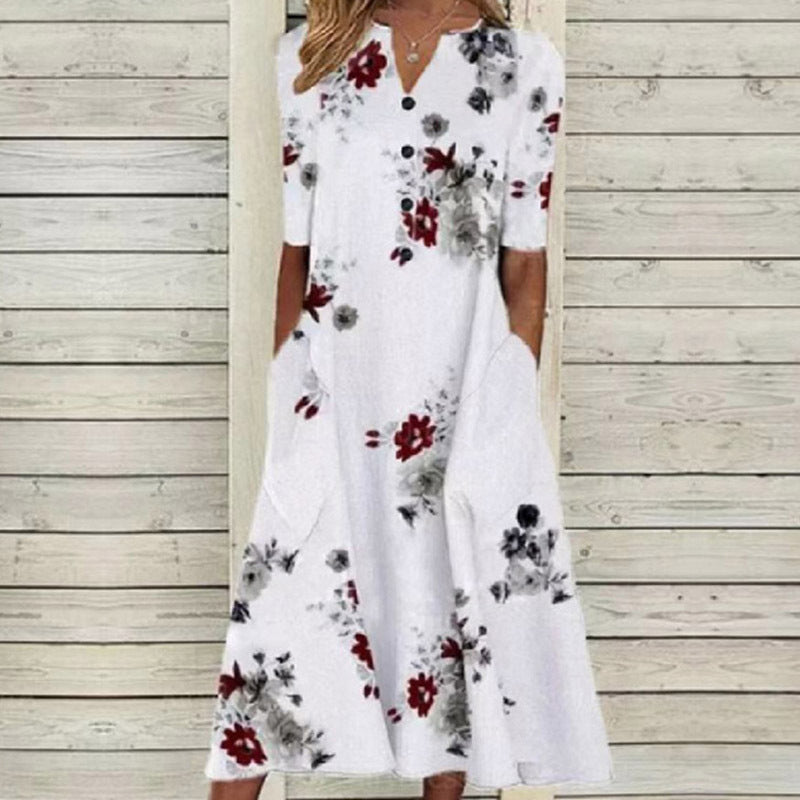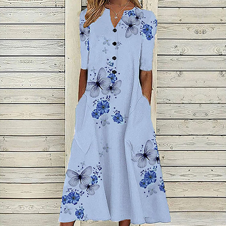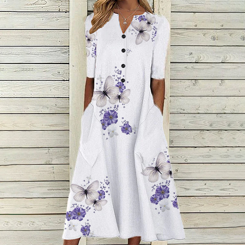 Blommig A-line Sommardamklänning med Fickor och V-ringning