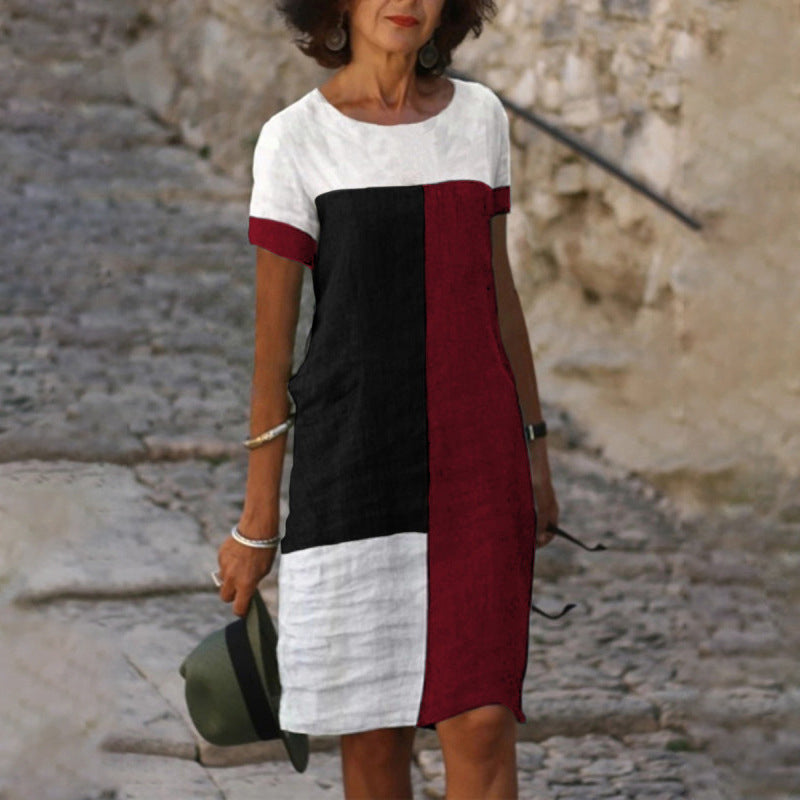 Kortärmad damklänning med rund hals, färgblockmönster, knälång och chic design för vår- och sommaraktiviteter.