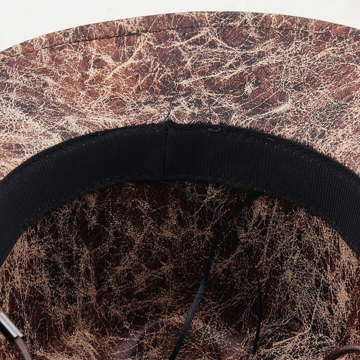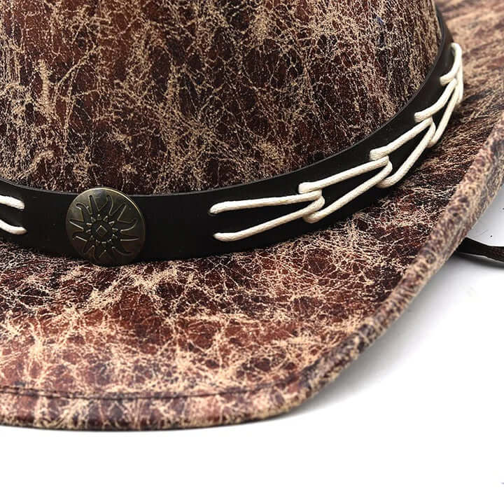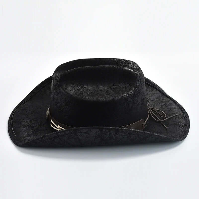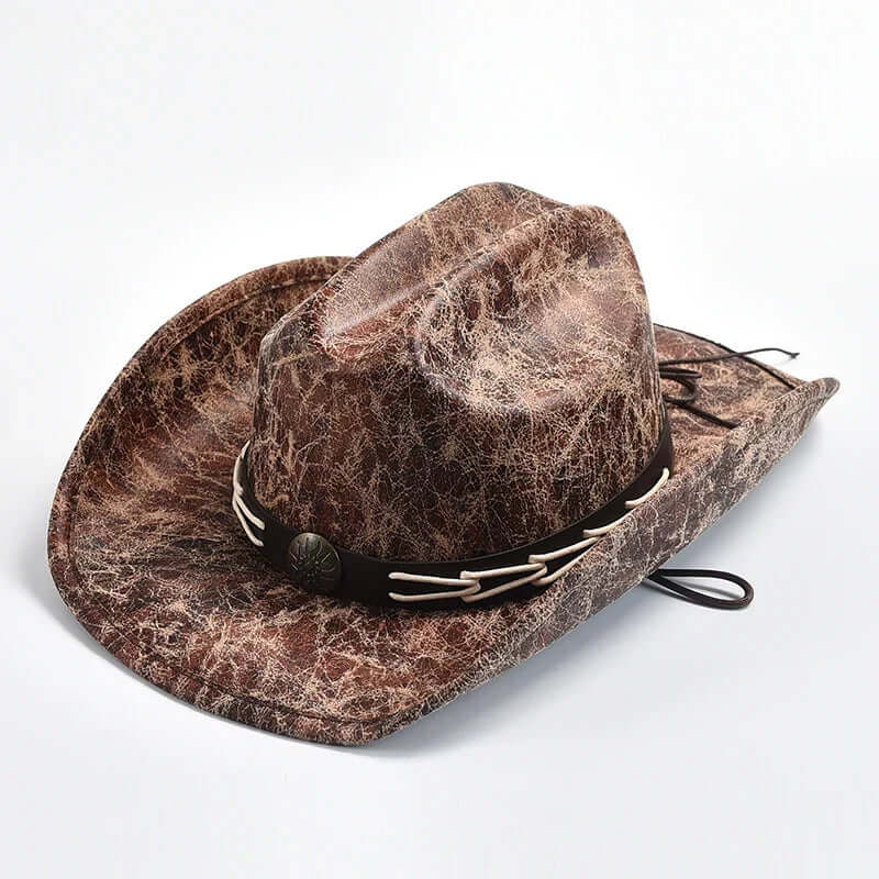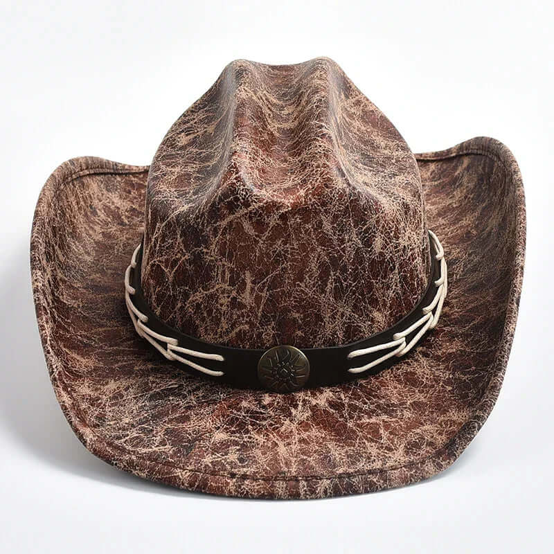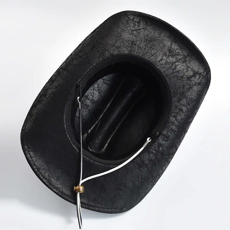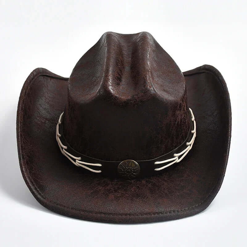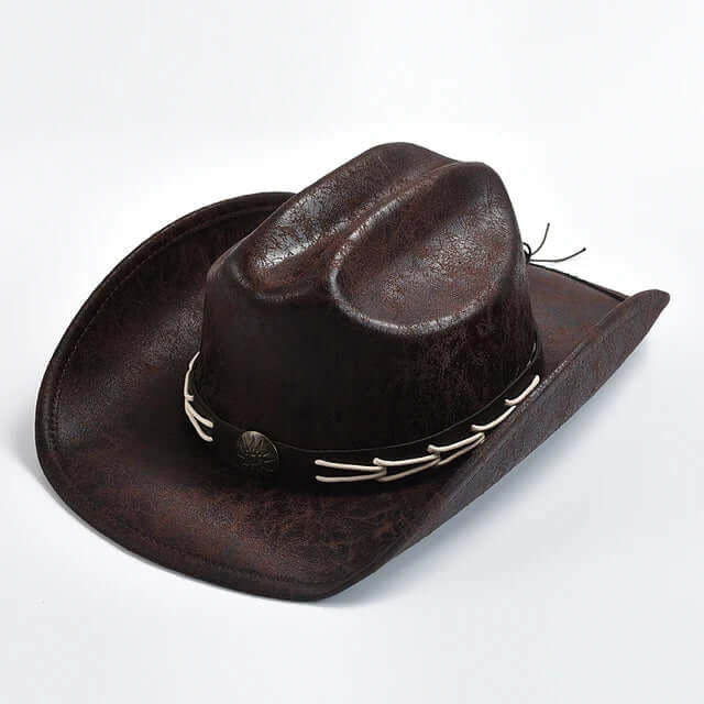 Denna lädercowboyhatt är det perfekta tillskottet för en äkta westernlook. Med en hög kulle och ett brett brätte skyddar den både mot solen och förstärker din outfit. Det dekorativa bandet med benpärlor ger en rustik och tidlös känsla, perfekt för dig som älskar westernmode eller behöver en slitstark hatt för utomhusaktiviteter.