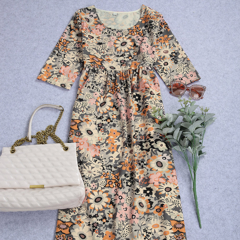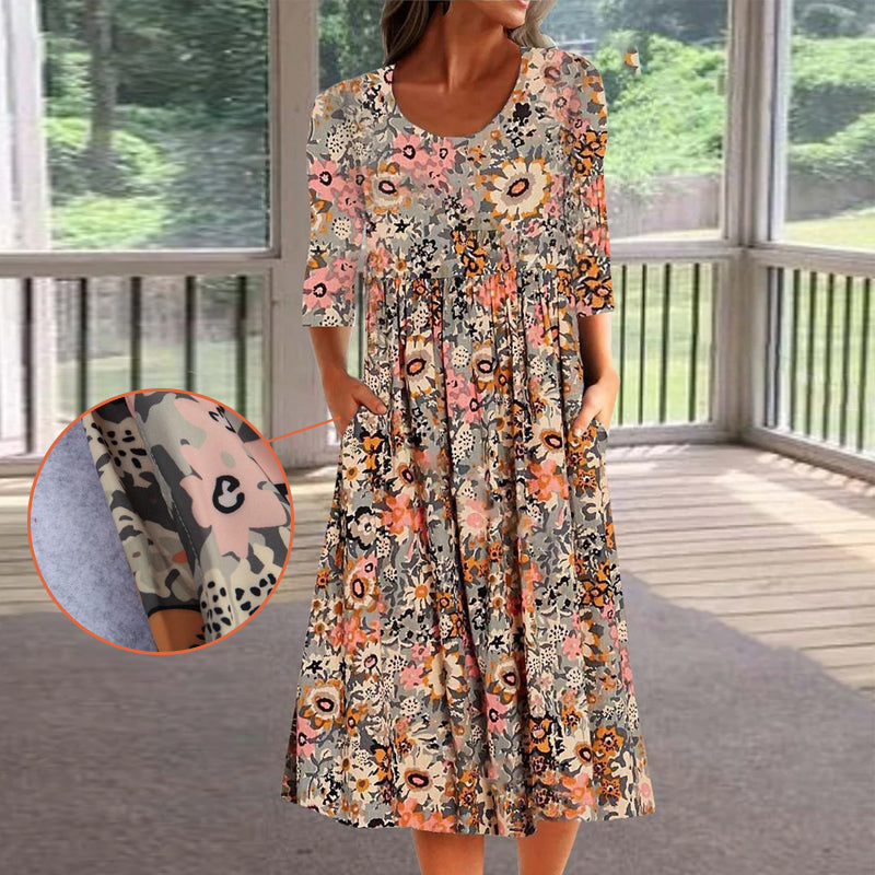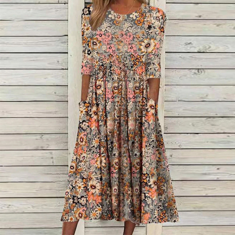 • Blommönster och A-linje siluett för en figursmickrande stil.