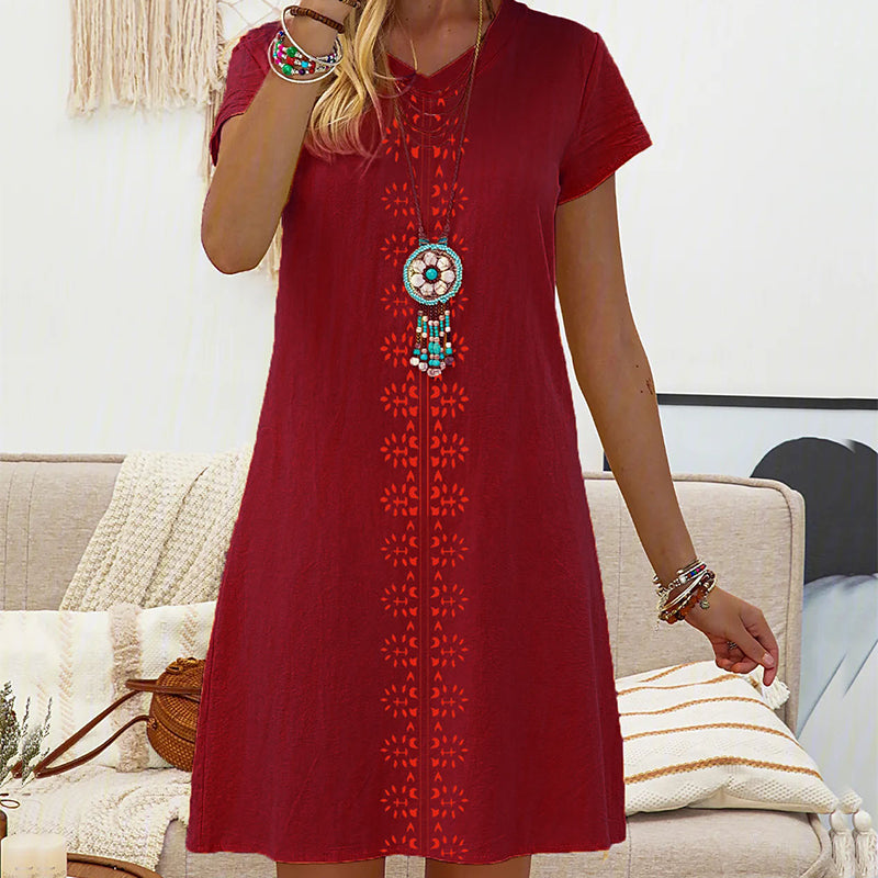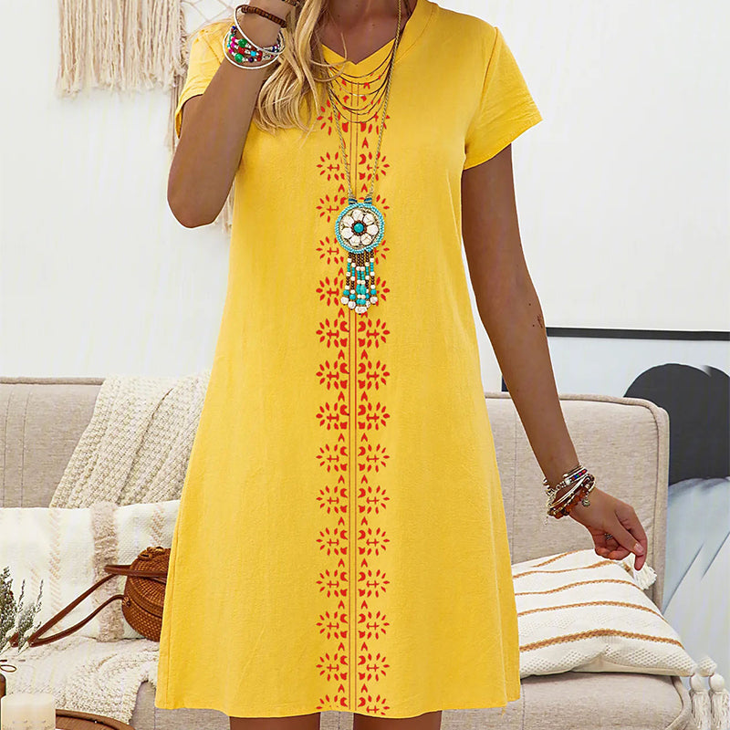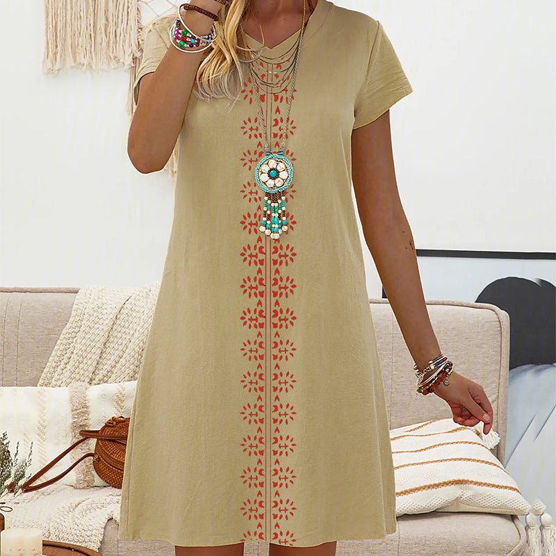 Upptäck en stilfull uppdatering till din garderob med denna eleganta damklänning. Den har en smickrande V-ringning, korta ärmar och ett unikt tryck som fångar ögat. Perfekt för både vardagsbruk och speciella tillfällen.