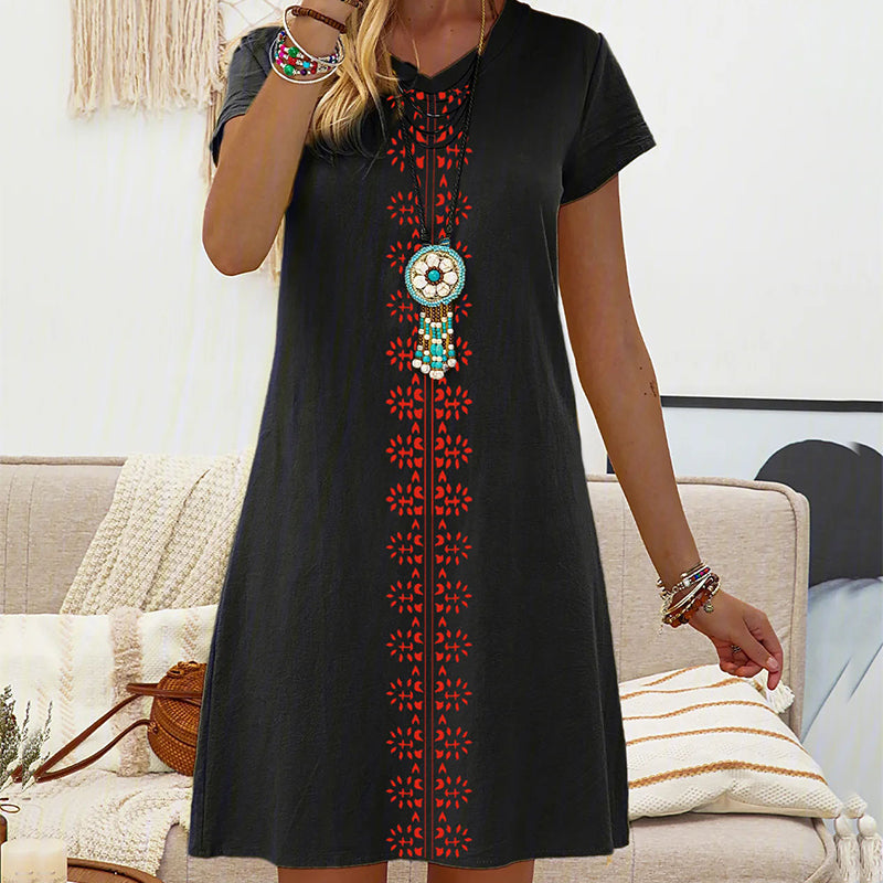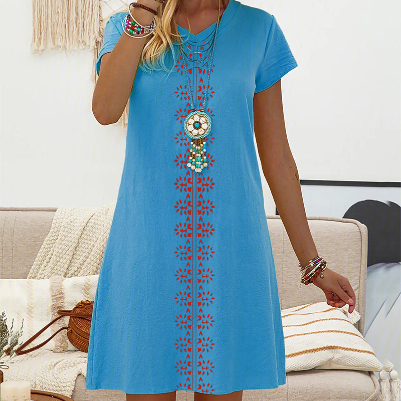 "Elegant damklänning med V-ringning, korta ärmar och unikt tryck. Perfekt A-linje passform för stil och komfort."