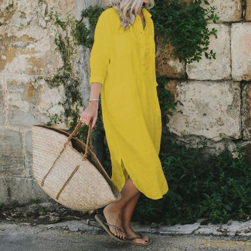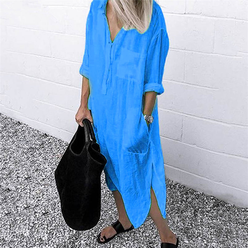 Dam V-ringad Långskjortklänning med Knappar och Fickor