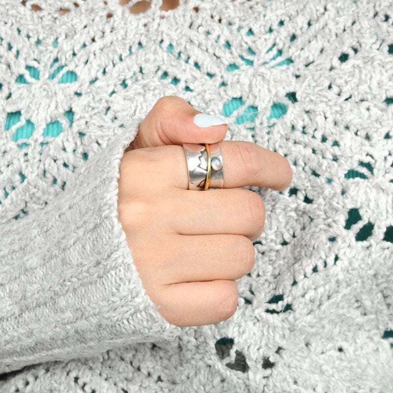 Upptäck elegansen hos vår vackra guldfärgade spinnerring, inspirerad av naturens skönhet med förtrollande berg och månmotiv. Perfekt för dig som söker en unik och stilfull accessoar som fångar uppmärksamheten och skapar samtalsämnen. Tillverkad för att passa både till vardags och speciella tillfällen, kommer denna ring definitivt att bli en favorit i din smyckeskollektion.