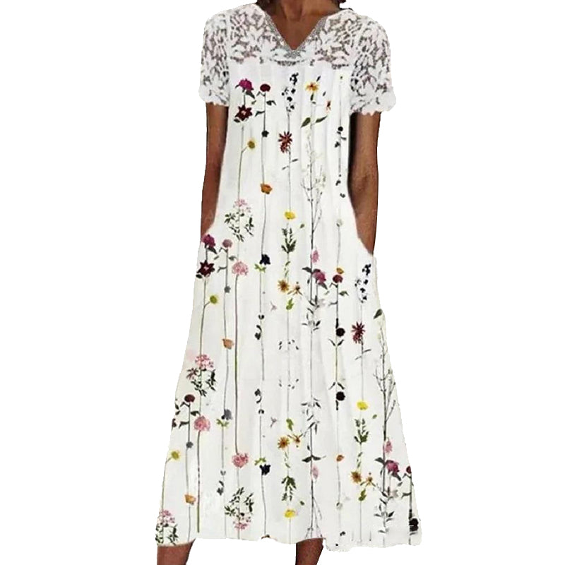 Välkommen till din nya stilhöjdpunkt med denna eleganta blommiga klänning! Med sitt vackra spetsdetaljer vid halsringningen är den designad för att ge dig en sofistikerad och fräsch look oavsett tillfälle.