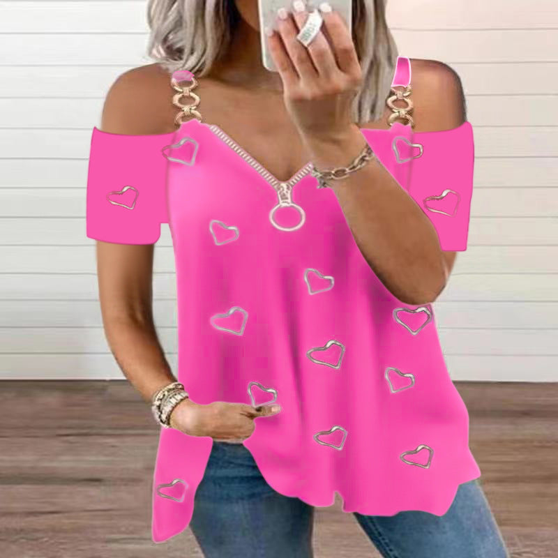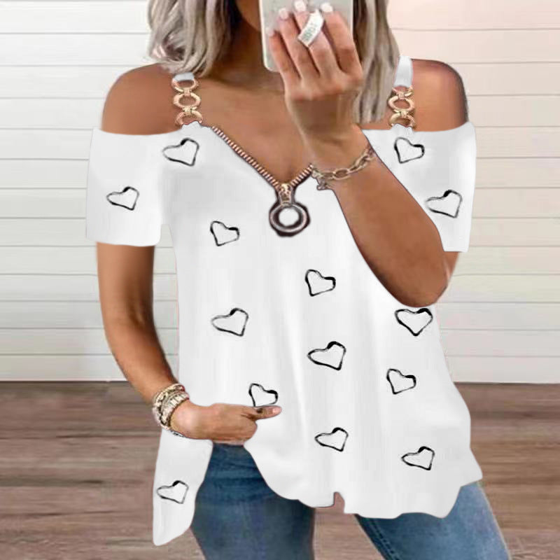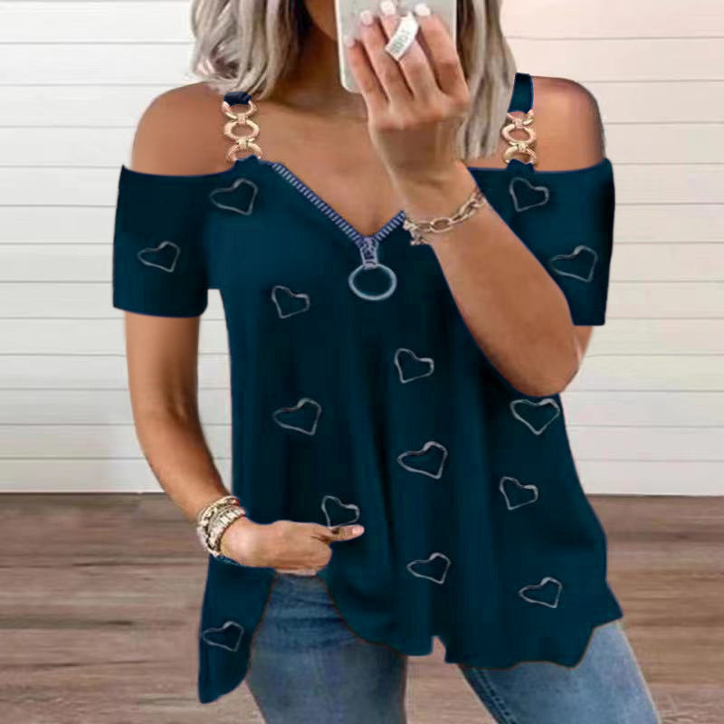 Upptäck vår stilfulla V-ringade kortärmade t-shirt med unika dragkedjor på axlarna. Den här toppen kombinerar komfort och mode för att skapa en perfekt look.