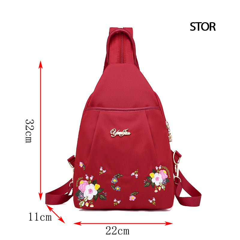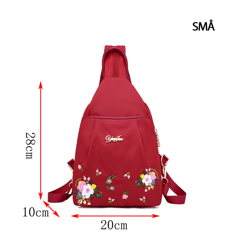 Denna eleganta damryggsäck, med sin blommiga design, kombinerar stil med funktionalitet och är tillverkad av hållbart oxfordtyg och polyester. Ryggsäcken är perfekt för dagligt bruk och små resor, och den finns i två klassiska färgval, röd och svart.