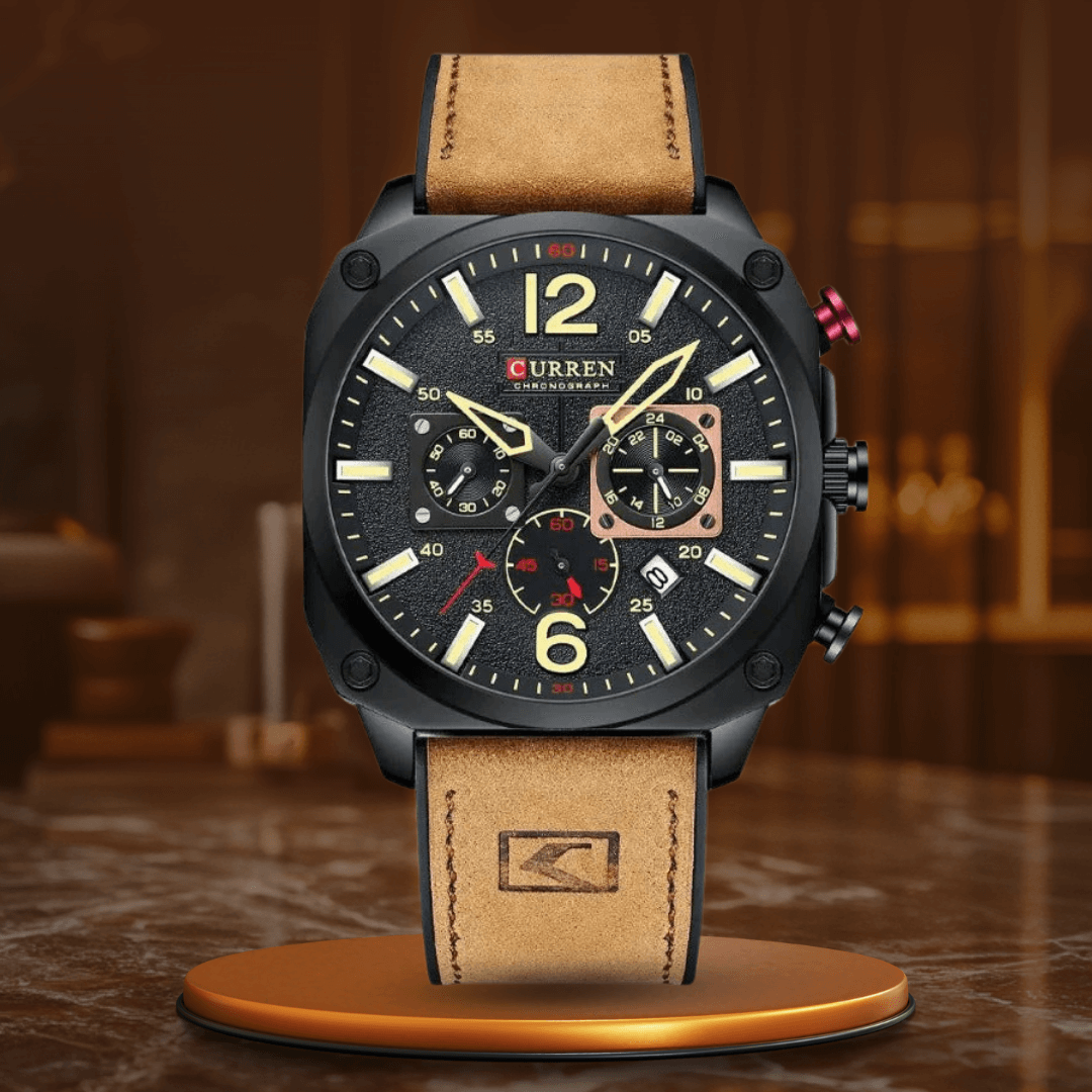 Detta armbandsur i läder är en perfekt blandning av lyx och funktionalitet. Med en tunn kvartsmekanism med sex visare erbjuder denna klocka oöverträffad precision och sofistikerad design. Det äkta läderarmbandet ger en touch av klass och säkerställer maximal komfort, vilket gör den idealisk för både styrelserum och avslappnade utflykter. Den djärva men ändå minimalistiska designen på urtavlan kompletterar vilken outfit som helst.