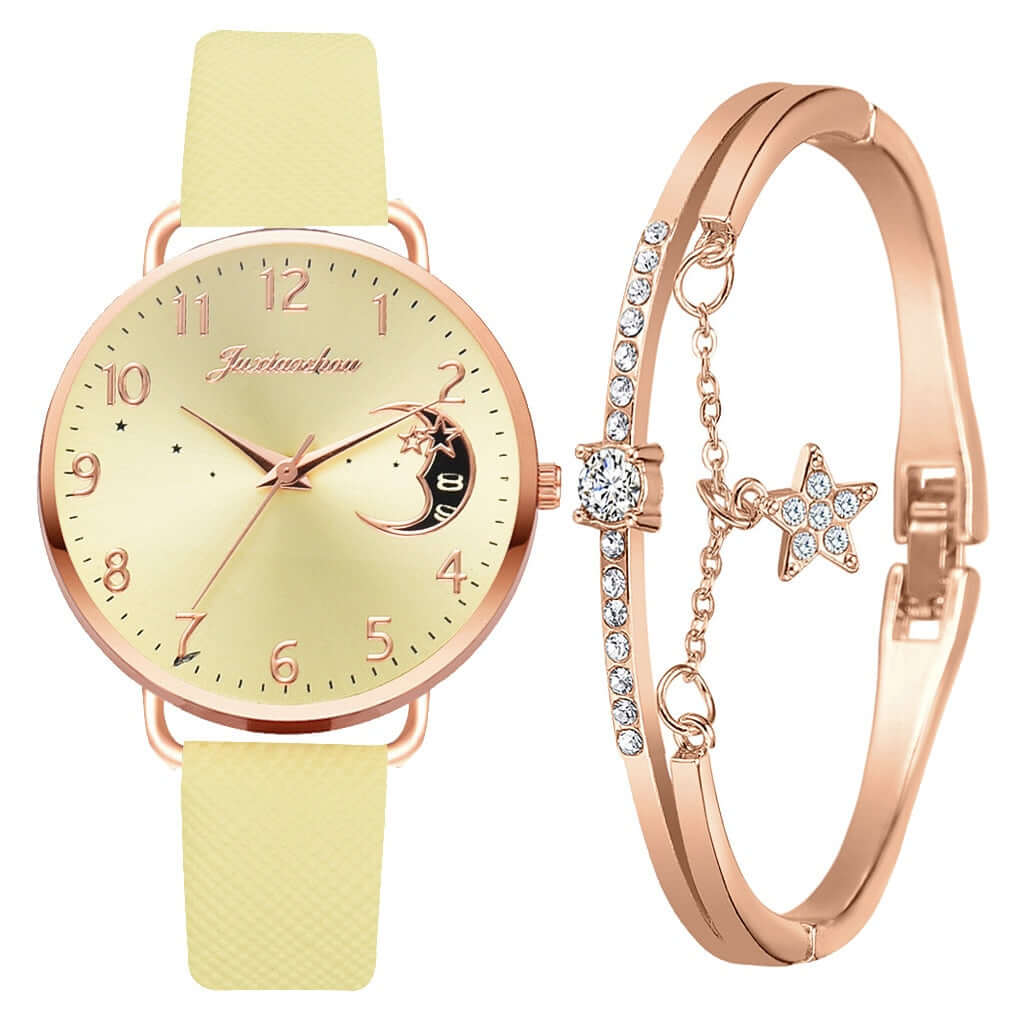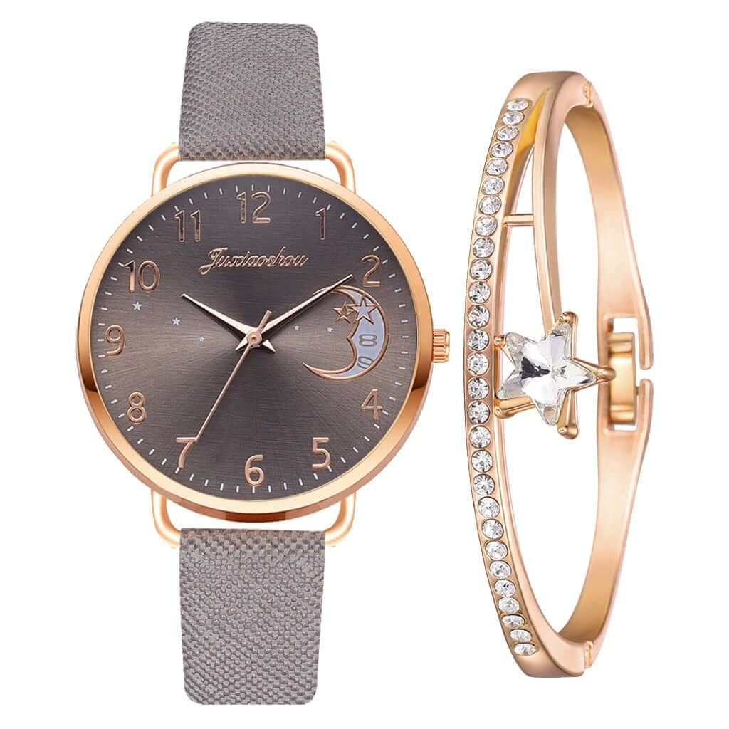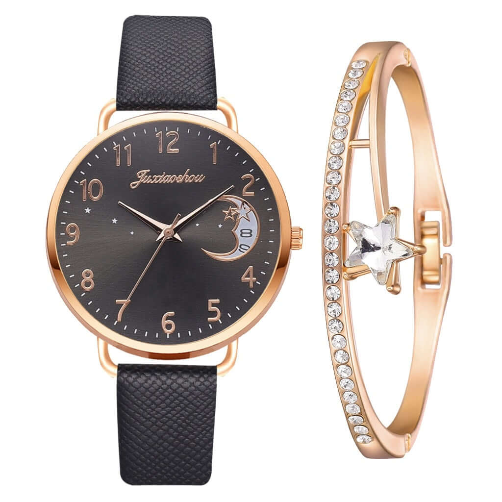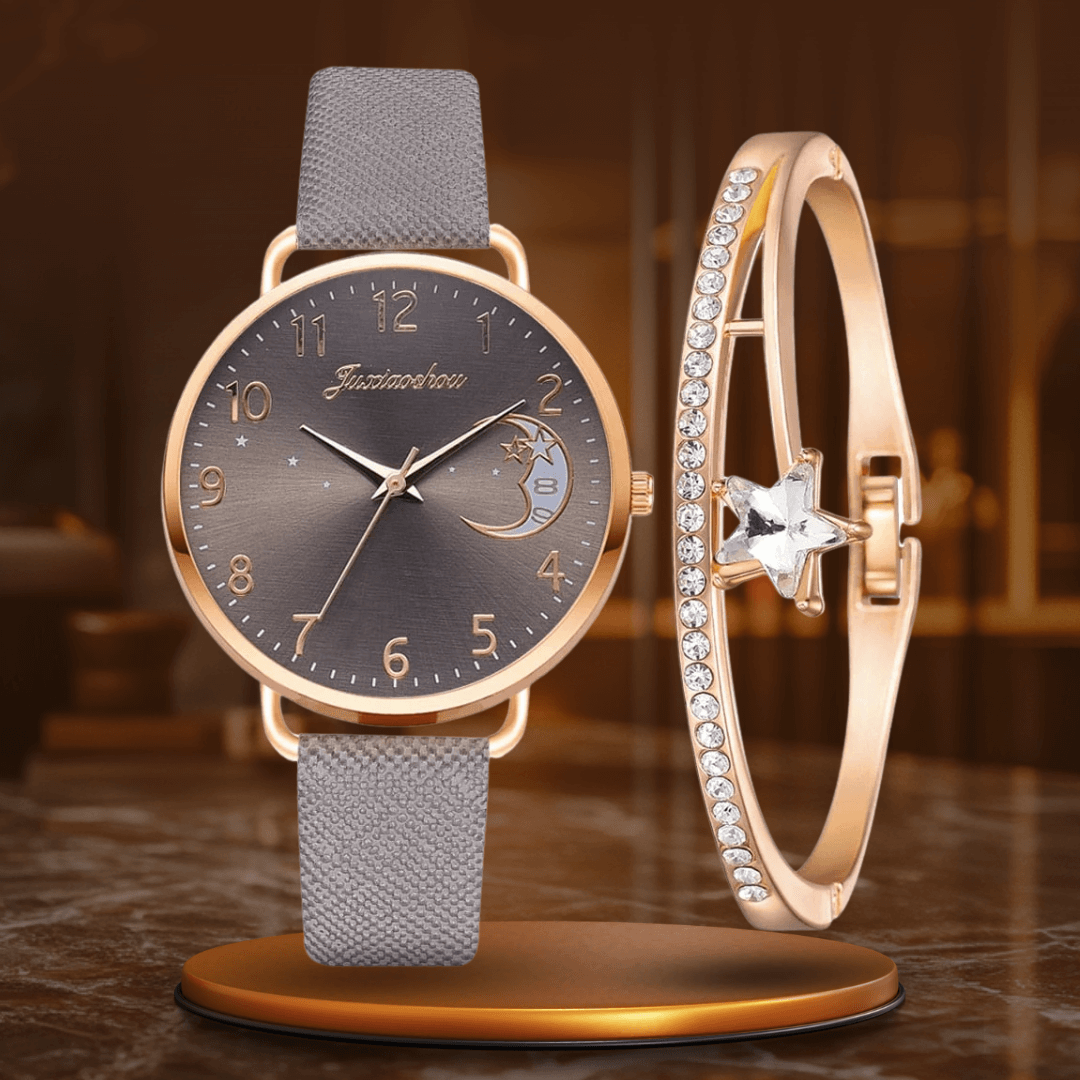 Detta klock- och armbandset med måninspirerad urtavla erbjuder en vacker design kombinerat med pålitlig kvartsprecision, perfekt för alla tillfällen. Med en månliknande urtavla och ett elegant läderband utstrålar denna klocka sofistikering. Det matchande armbandet ger en touch av glamour, vilket gör setet perfekt för både vardagliga och formella evenemang.