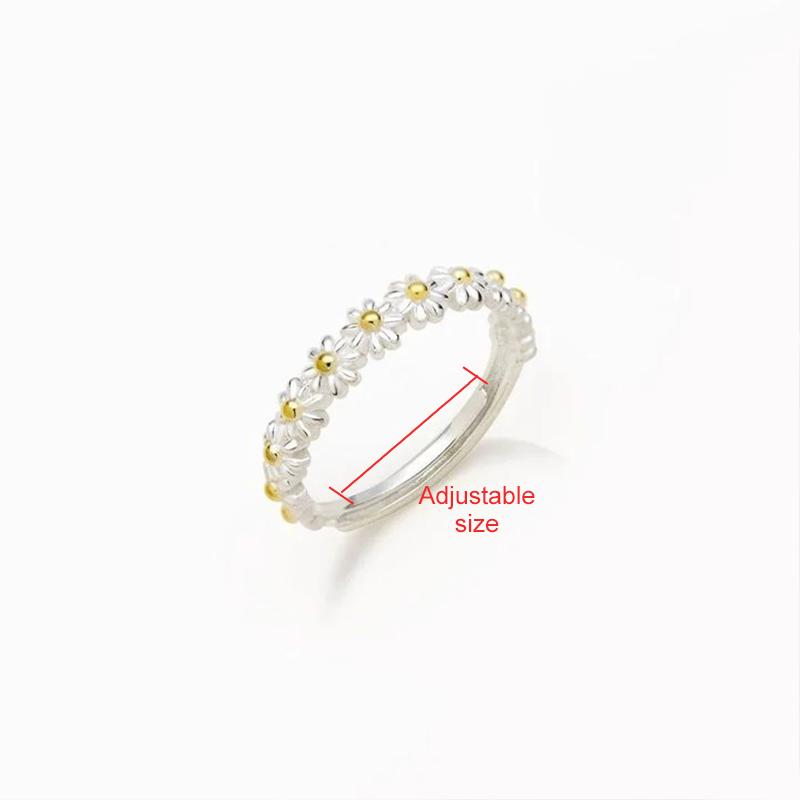 "Elegant justerbar ring för kvinnor med små tusenskönor, silverfärgad, symboliserar glädje och oskyldighet."