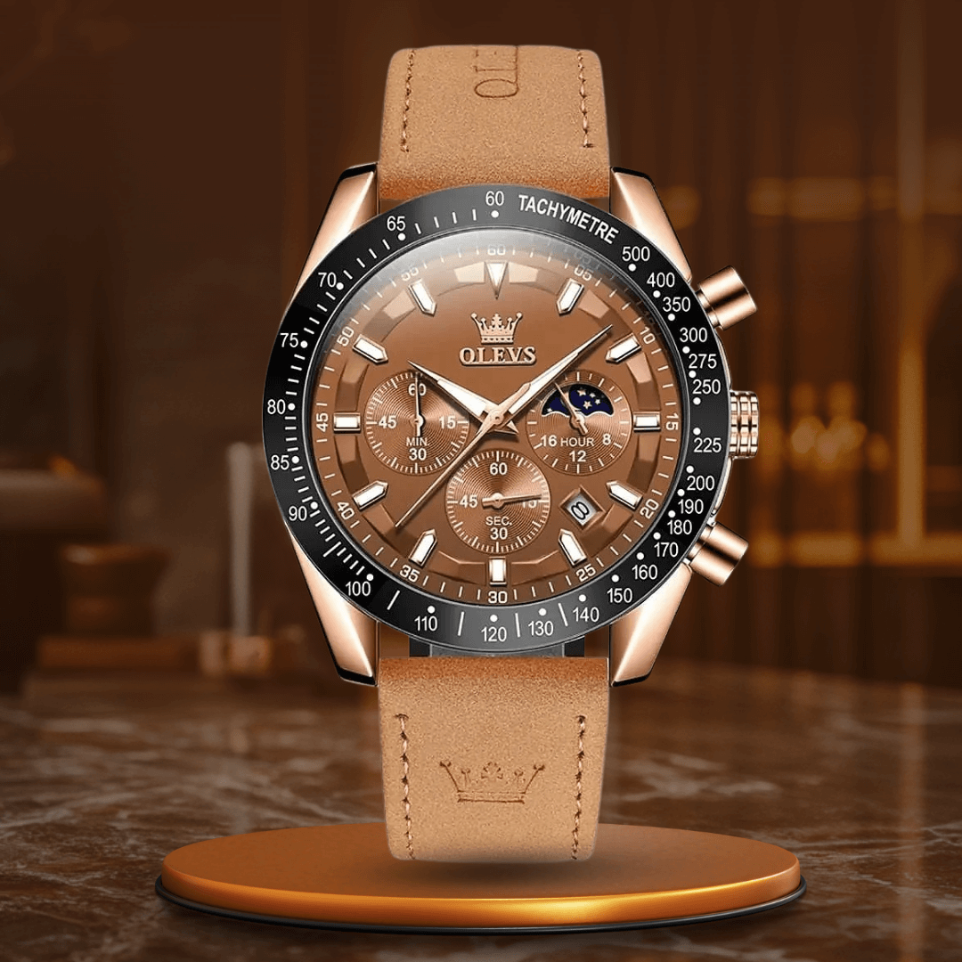Denna klassiska kvartsklocka med läderrem är den perfekta blandningen av stil och prestanda. Med en tunn, klassisk design erbjuder klockan kalender- och månfasvisning, så att du alltid har koll på tiden och naturens cykler. De självlysande visarna ger god synlighet i svagt ljus, medan vattentåligheten gör att du kan bära den utan bekymmer oavsett väder. Oavsett om du är på väg till ett affärsmöte eller ett utomhusäventyr är denna klocka redo för allt.