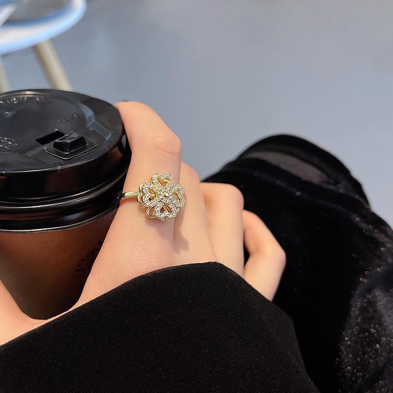 "Roterande fyrklöver ring för kvinnor, i silver eller guld med zirkonstenar, elegant design för modern stil."
