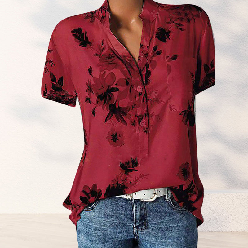 Kvinnors Blommig Kortärmad Skjorta med Ficka