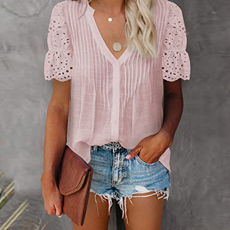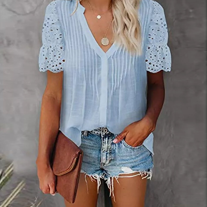 Kvinnors Plisserad V-Ringad Skjorta i Sommarstil