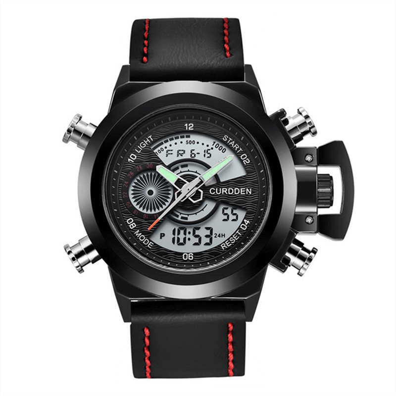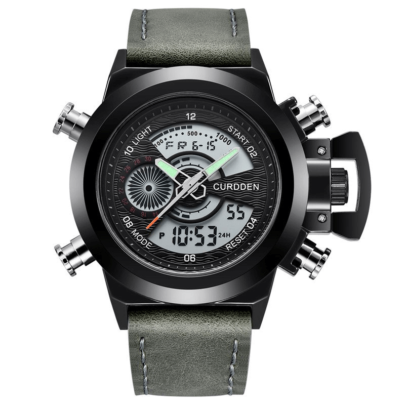 Denna multifunktionella digitala kronografklocka är din ultimata följeslagare. Oavsett om du är på väg till ett affärsmöte, utforskar naturen eller gymmar, är denna militärinspirerade multifunktionsklocka designad för att hänga med. Med dubbla tidszoner kan du enkelt hålla koll på två tidszoner, vilket gör den idealisk för frekventa resenärer eller de med globala kontakter. Det slitstarka läderarmbandet garanterar komfort, medan den robusta men eleganta designen ger en sofistikerad touch till din look.