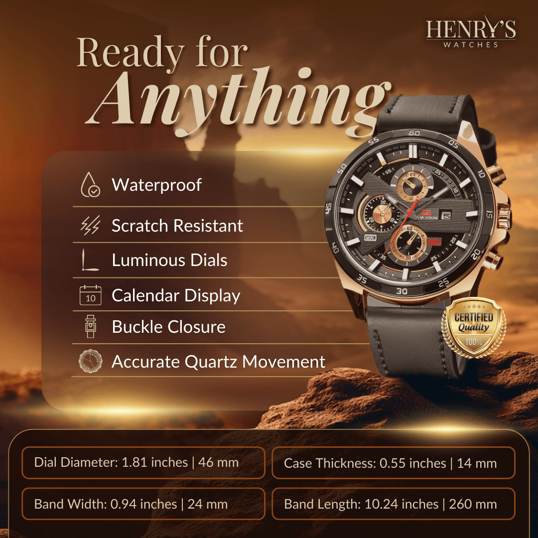 Designad för precision och prestanda har denna klocka ett högkvalitativt kvartsurverk som garanterar exakt tidtagning. Det bekväma läderarmbandet och den robusta designen gör den idealisk för daglig användning eller sportaktiviteter. Uppgradera din handled med en klocka som erbjuder både elegans och funktionalitet.