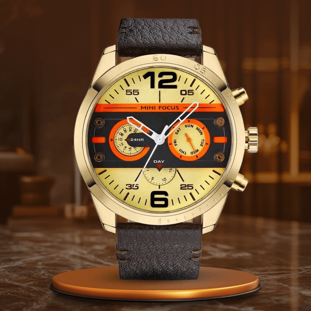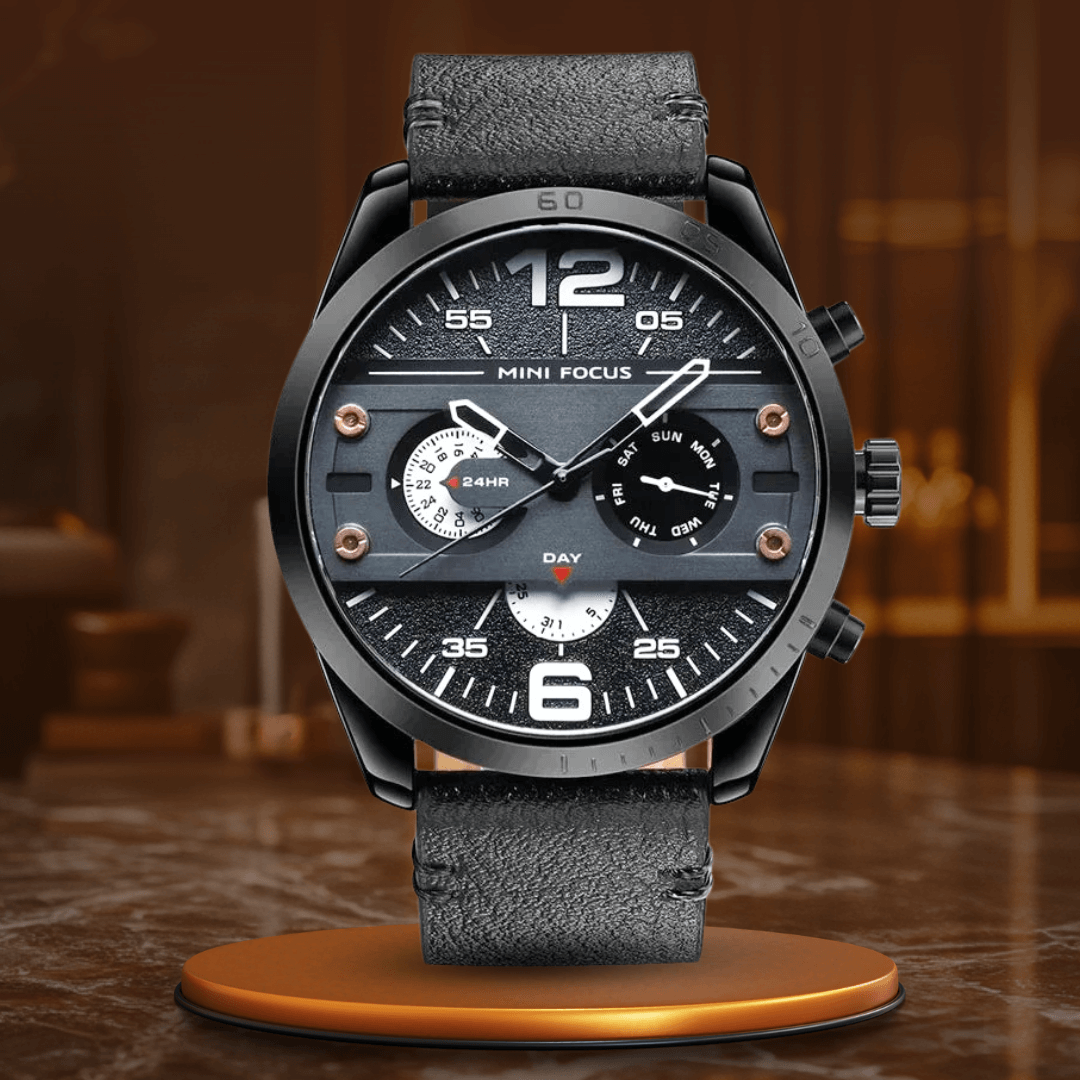 Denna snygga kvartskronograf med vattentätt sportutförande och läderband är designad för den moderna personen som uppskattar både stil och funktionalitet. Med sin djärva svarta design och högkvalitativa läderrem gör denna klocka ett uttalande oavsett om du är på kontoret eller ute på ett weekendäventyr. Den exakta kvartsrörelsen säkerställer korrekt tidtagning, medan kronografen och de vattentäta funktionerna gör den praktisk för alla dina aktiviteter, från sport till sociala evenemang.