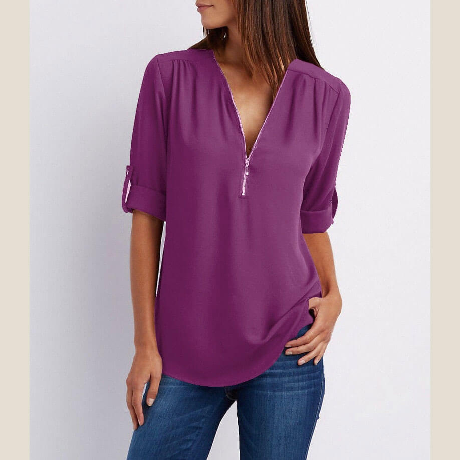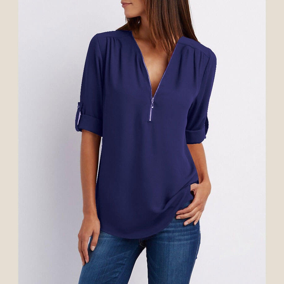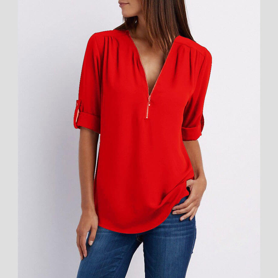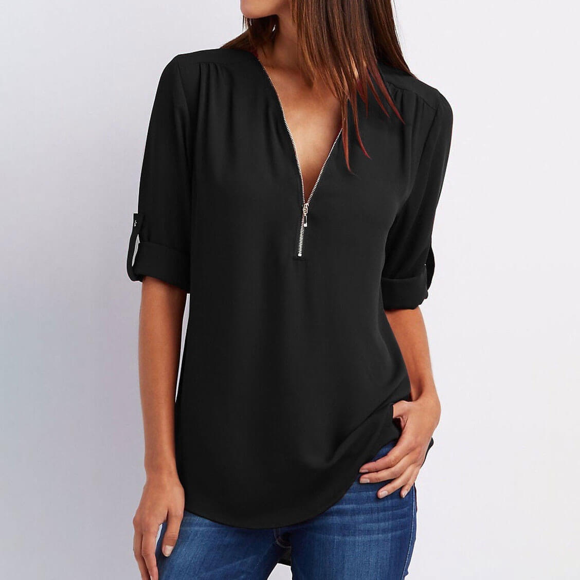 Dessa chiffongöverdelar med långa ärmar och dragkedja för damer passar för alla tillfällen, t.ex. vardaglig fritid, kontorsarbete, affärsaktiviteter, fester, klubbar och möten.Den här underbara skjortan kan matchas med jeans, shorts, kjolar och leggings för att visa upp olika stilar.