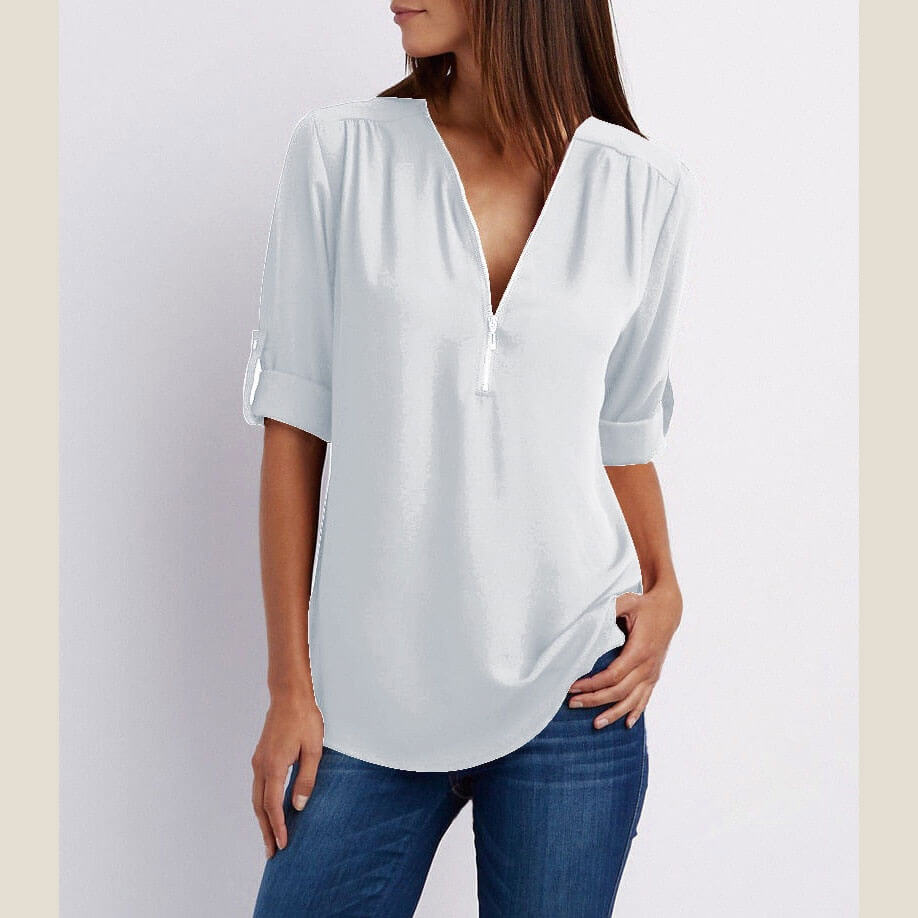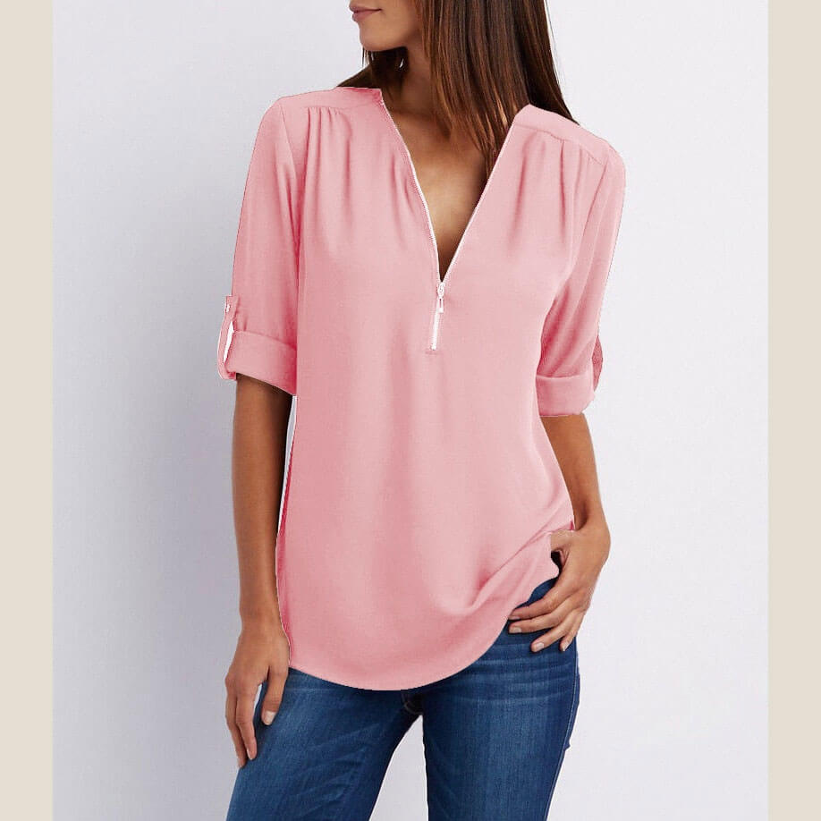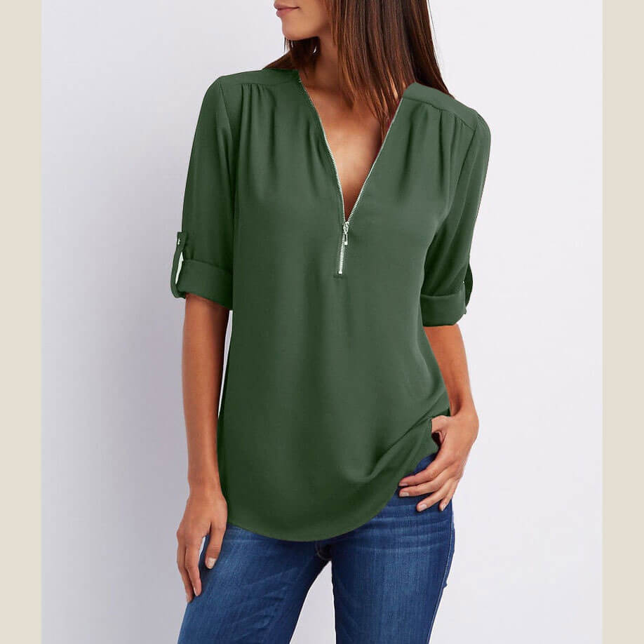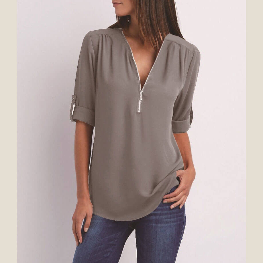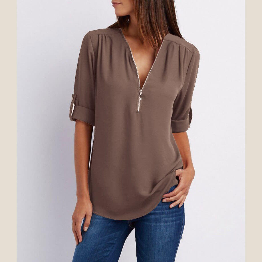 Dessa chiffongöverdelar med långa ärmar och dragkedja för damer passar för alla tillfällen, t.ex. vardaglig fritid, kontorsarbete, affärsaktiviteter, fester, klubbar och möten.Den här underbara skjortan kan matchas med jeans, shorts, kjolar och leggings för att visa upp olika stilar.