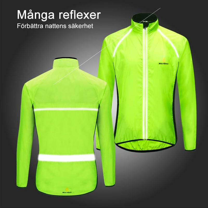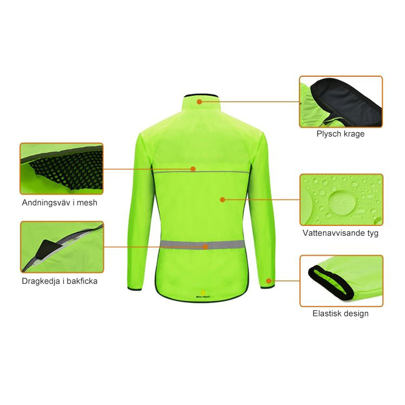 Unisex vattentät sport vindjacka i polyester, finns i flera färger som grön och orange, reflekterande detaljer.
