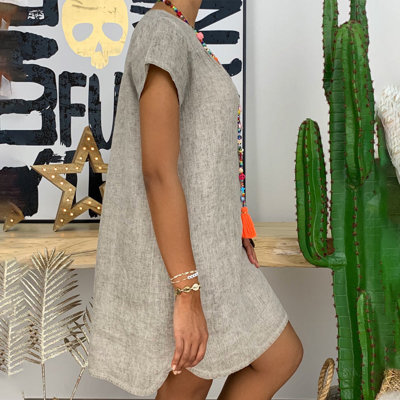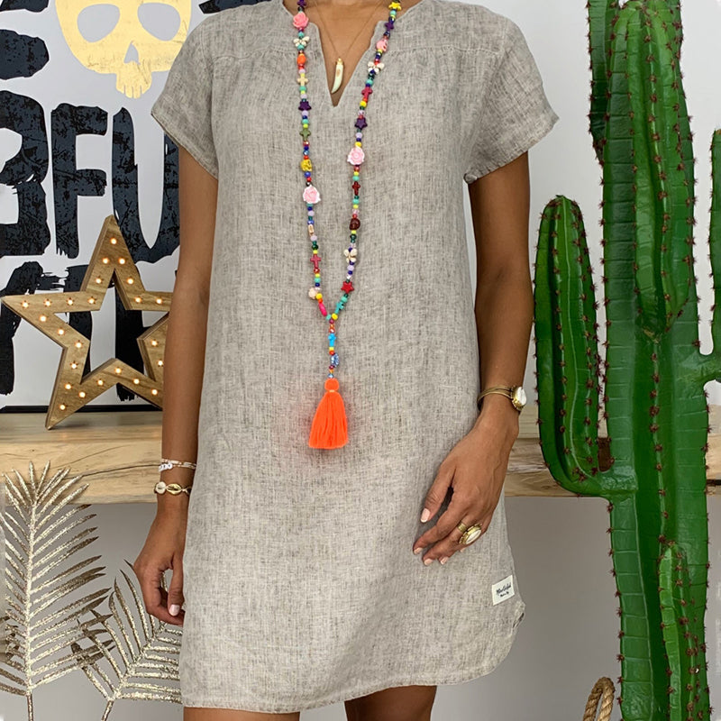 V-ringad klänning för kvinnor i bomull och linne