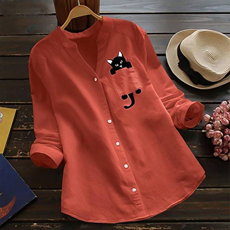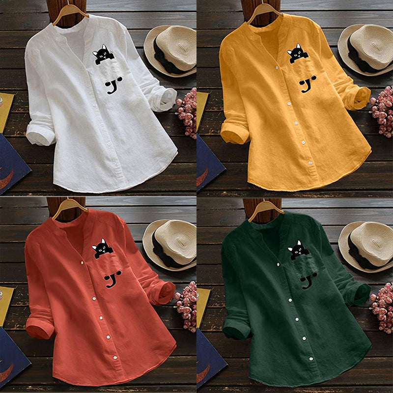 With its versatility and stylish look, this V-neck long-sleeved cotton blouse with cat print is a must-have for every modern woman. Get ready to turn heads with this unique piece!