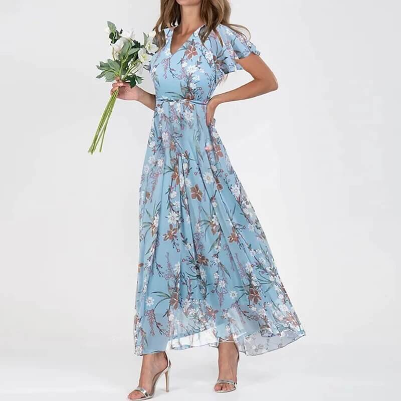 Lång sommarklänning med blommigt mönster och smickrande passform