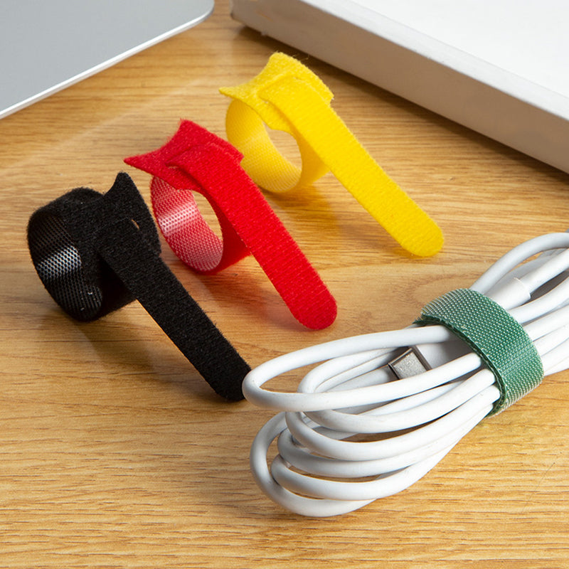 "Återanvändbara kardborresladdband i olika färger, perfekt för bekväm kabelhantering och organisation av kablar."