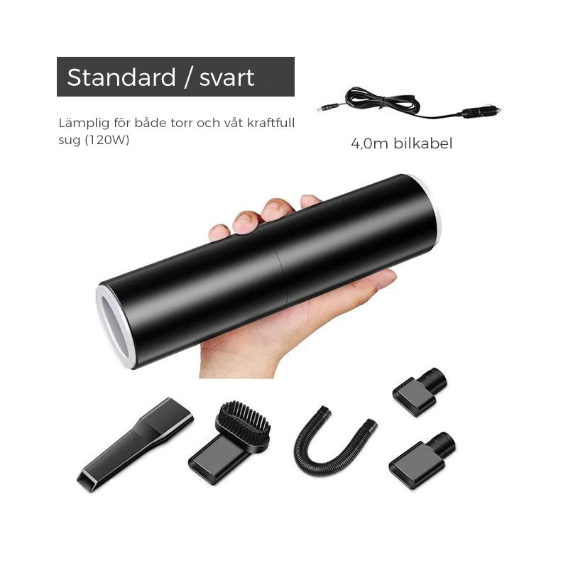 "Kompakt bärbar handdammsugare med kraftig sugning, perfekt för bilinteriörstädning. Svart design med mångsidiga munstycken."