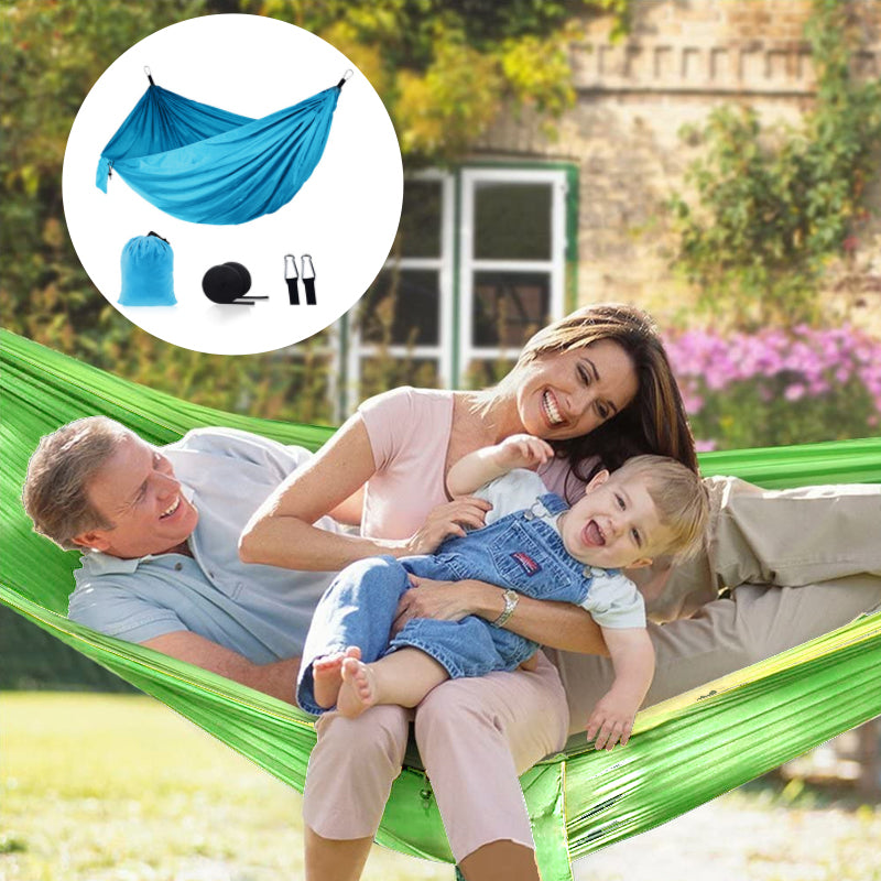 "Blå campinghängmatta för två personer i slitstark fallskärmsnylon, perfekt för utomhusäventyr och trädgårdsavkoppling."