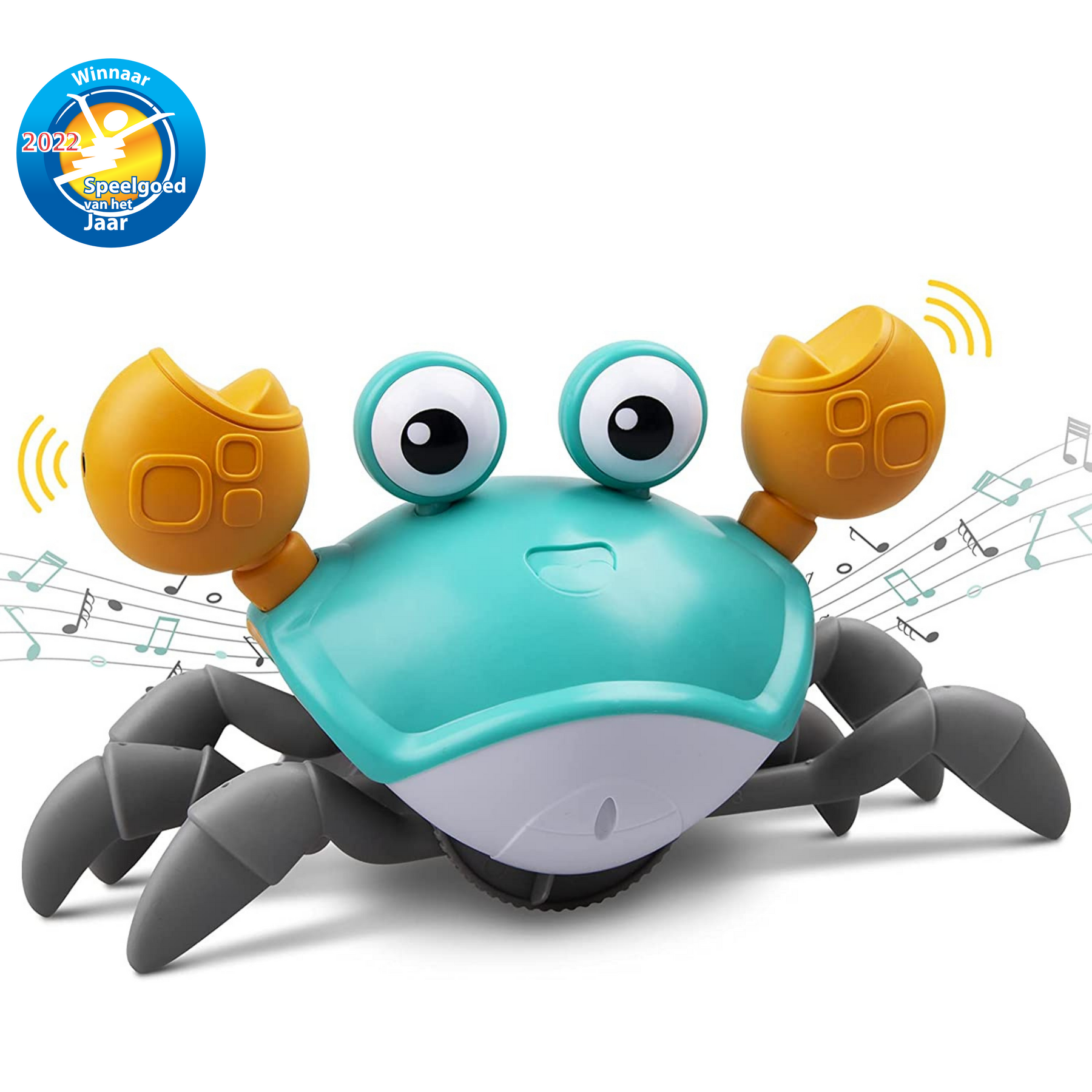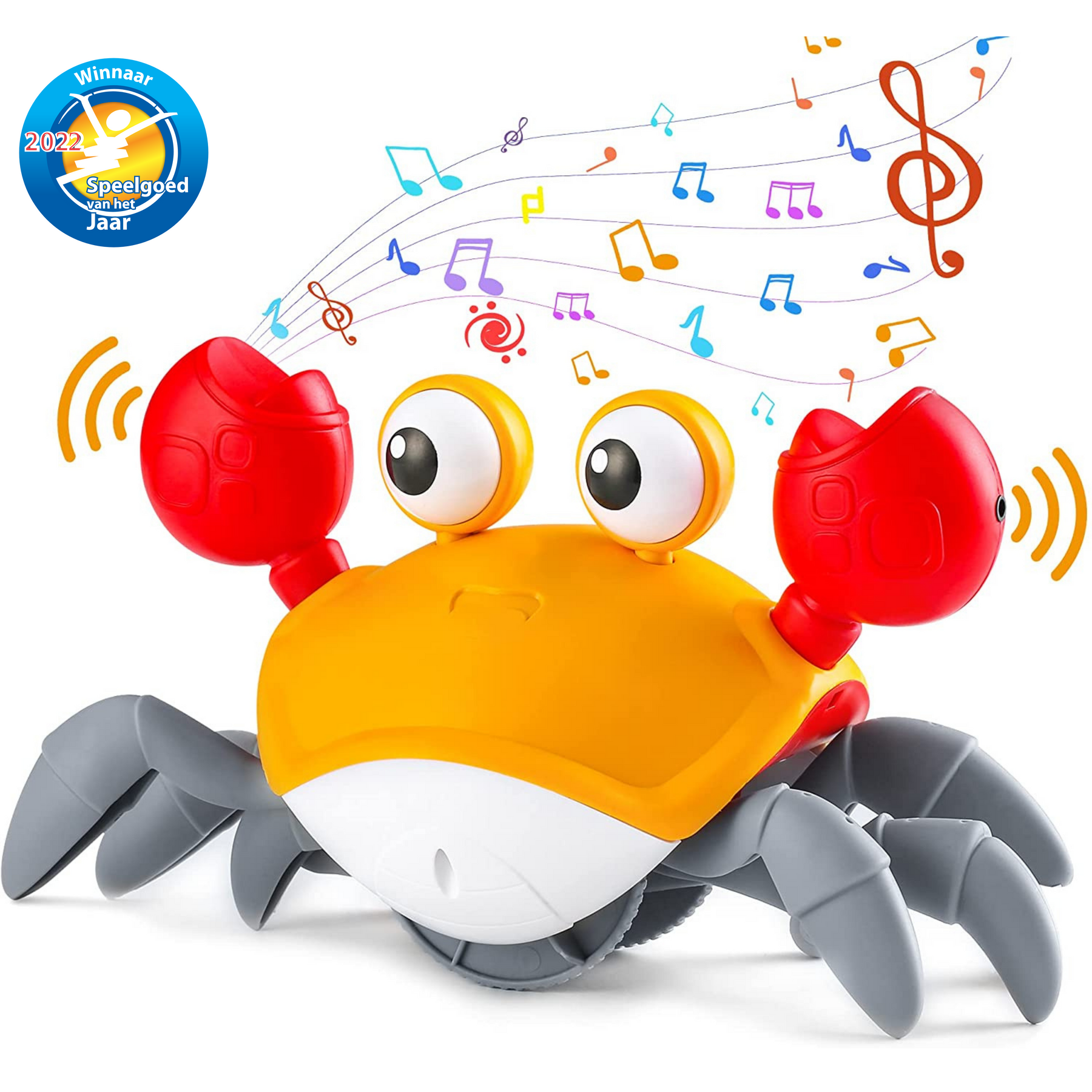 Den gående krabban undviker automatiskt hinder. Om du tror att du ska fånga krabban kommer den att springa åt andra hållet. Detta gör att det alltid är roligt att krypa efter krabban. Den krypande krabban är tillverkad av högkvalitativt ABS-material. Det är giftfritt och smaklöst. Ytan är slät och det finns inga vassa kanter. Idealisk leksak för barn äldre än 6 månader.