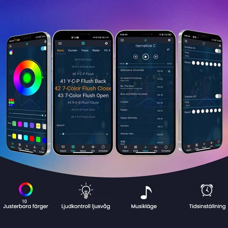 • Bluetooth och IR-fjärrkontroll: Styr ljuslägen via din smartphone eller fjärrkontroll.